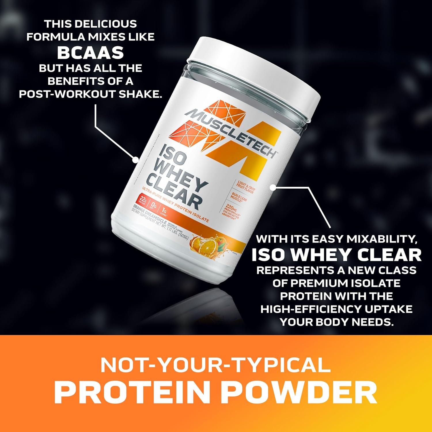 About this item A Lighter, Cleaner Protein Experience: MuscleTech Iso Whey Clear is a breakthrough alternative for those looking for a light, clean way to get their protein. Orange Dreamsicle flavor. 19 servings. Not-Your-Typical-Protein: We’ve put a new spin on the usual milkshake-based protein. This delicious formula mixes like BCAAs, but has all the benefits of a post-workout shake, with 22g of pure whey protein isolate. Unmatched Formula: With its easy mixability, Iso Whey Clear represents a new of premium isolate protein with the high-efficiency uptake your body needs. Mind-Blowing Flavor: Your goals are so close you can taste ‘em. We worked tirelessly with the world’s top flavor houses to produce something you’ll love. Directions: Mix 1 scoop in 12 oz. of water in a shaker cup. Shake vigorously and let rest for 30 to 60 seconds, as the powder transforms into a translucent protein beverage. Pushing the Limits of Science and Human Potential: MuscleTech’s commitment to research, development, and innovation is the reason we continue to be an elite name for redefining performance through cutting-edge products and high-quality ingredients. › See more product details,A Lighter, Cleaner Protein Experience: MuscleTech Iso Whey Clear is a breakthrough alternative for those looking for a light, clean way to get their protein. Orange Dreamsicle flavor. 19 servings,Not-Your-Typical-Protein: We’ve put a new spin on the usual milkshake-based protein. This delicious formula mixes like BCAAs, but has all the benefits of a post-workout shake, with 22g of pure whey protein isolate,Unmatched Formula: With its easy mixability, Iso Whey Clear represents a new of premium isolate protein with the high-efficiency uptake your body needs,Mind-Blowing Flavor: Your goals are so close you can taste ‘em. We worked tirelessly with the world’s top flavor houses to produce something you’ll love,Directions: Mix 1 scoop in 12 oz. of water in a shaker cup. Shake vigorously and let rest for 30 to 60 seconds, as the powder transforms into a translucent protein beverage,Pushing the Limits of Science and Human Potential: MuscleTech’s commitment to research, development, and innovation is the reason we continue to be an elite name for redefining performance through cutting-edge products and high-quality ingredients