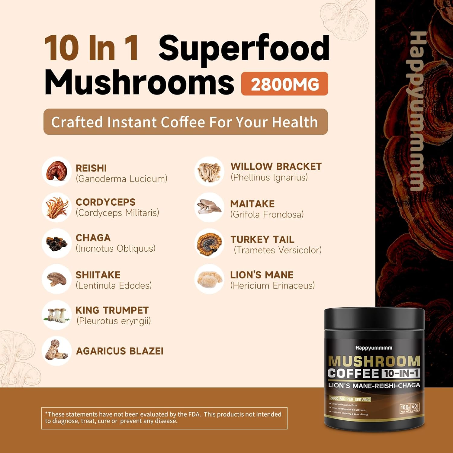 10-IN-1 MUSHROOM POWDER: Our mushroom coffee powder blend contains 10 premium blend mixes of ingredients such as Lion's mane, Reishi, Cordyceps, Turkey tail mushroom, Chaga, Maitake, Shiitake Mushroom, King Trumpet, Agaricus Blazei, and Willow Bracket. Lions Mane mushrooms powder has lots of nutrients for health, you will find lots of vitamins, calcium, and potassium. Mushroom powder coffee alternative is non-GMO, gluten-free ingredients
