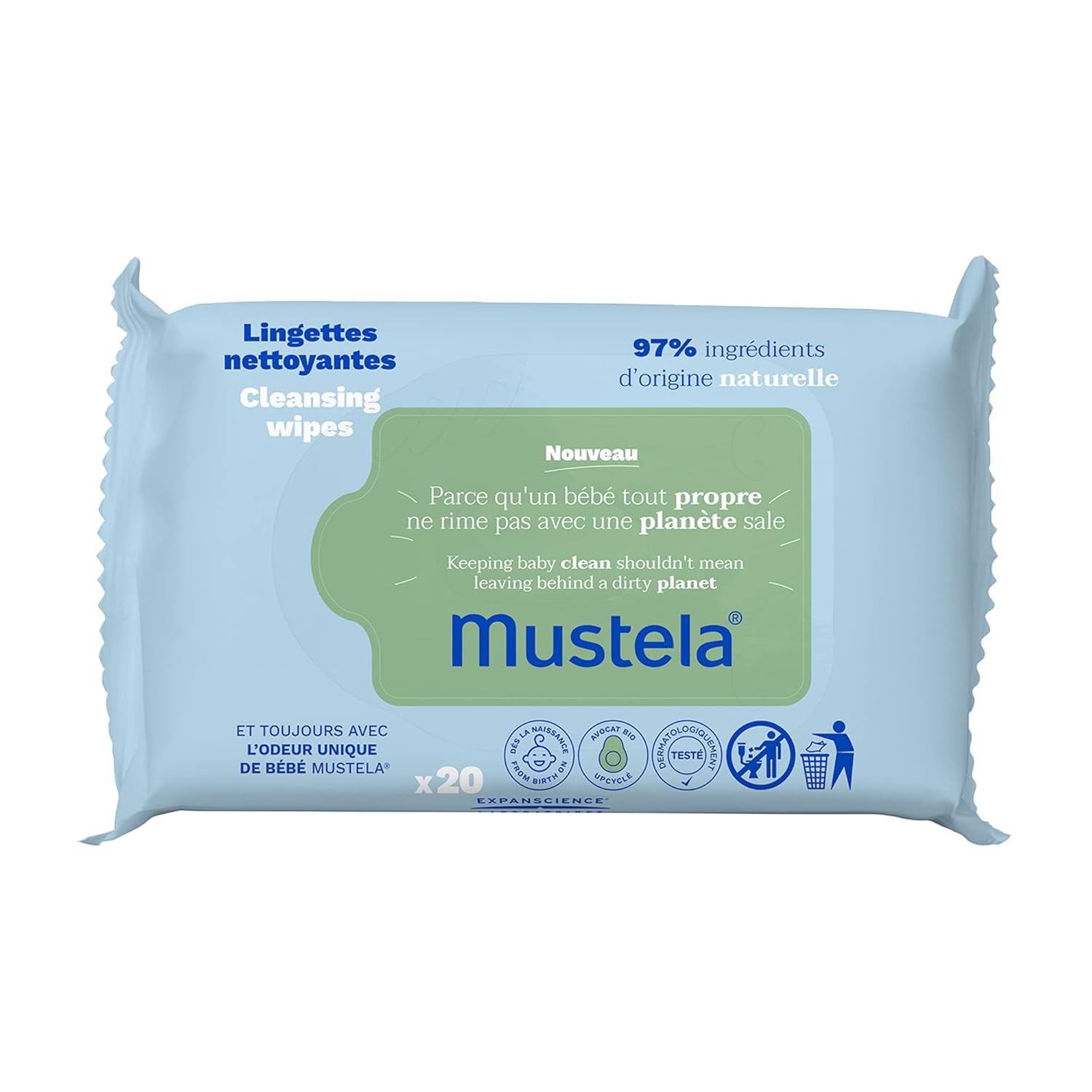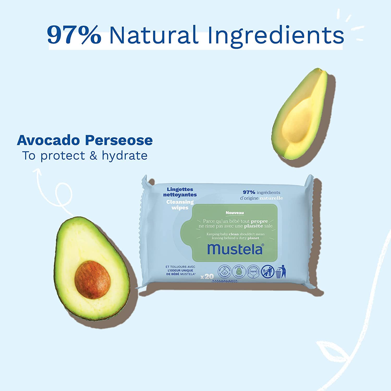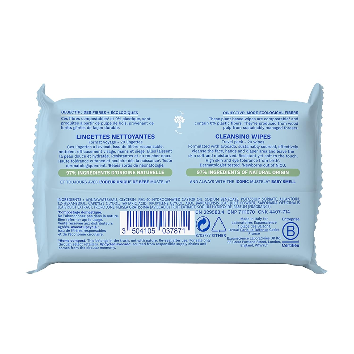 Mustela Baby Cleansing Wipes With Natural Avocado - For Face, Body & Diaper Area - Made With Compostable & Plastic Free Fibers - Lightly Scented - 20 Or 60 Ct. - 1, 3 Or 6-Pack