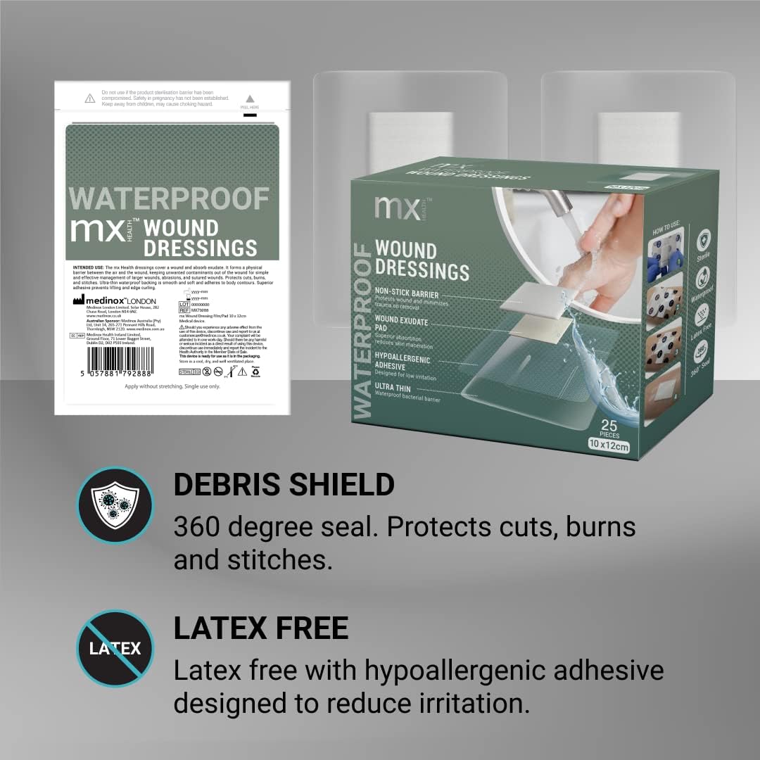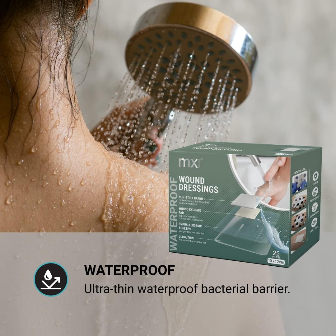 Mx Health Waterproof Wound Dressing Film+Pad - 10X12Cm (5X6Cm Wound Pad) - 25 Individually Wrapped Dressings Per Box