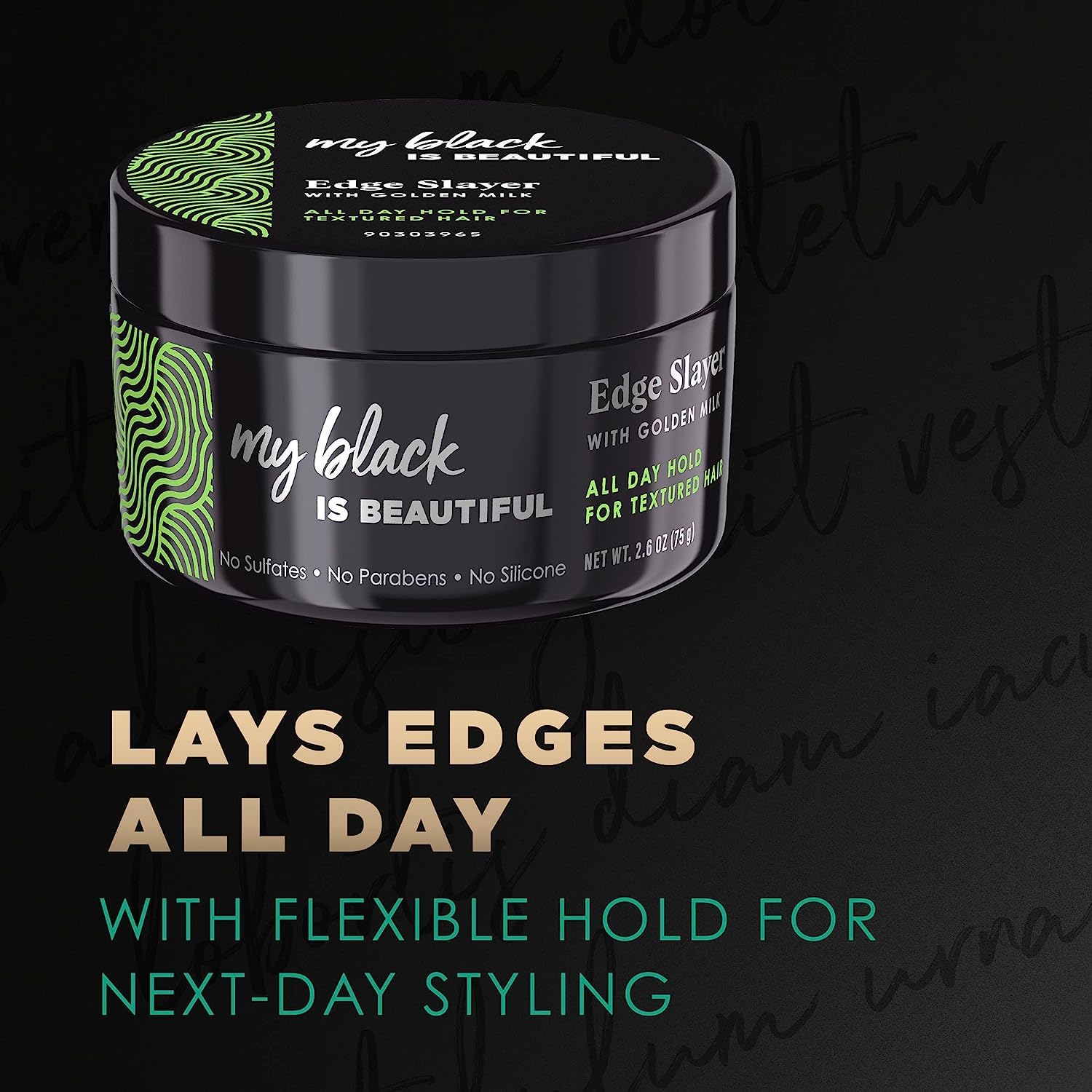 Designed with Black Women in mind, the My Black is Beautiful Golden Milk Collection is specially formulated with coconut milk, turmeric, ginger, honey, and coconut oil for healthy hair. Each product in this My Black is Beautiful collection, including the Edge Slayer, is a nutrient-rich source of essential vitamins, minerals, and amino acids known for healing and nourishing benefits. The My Black is Beautiful Edge Slayer is a natural edge control gel that lays your edges, providing an all day, flexible hold for next day restyling. This gel for curly hair edges is a residue and flake-free formula designed to keep your edges from reverting for smooth hair that slays. Since 2006, My Black is Beautiful has celebrated Black beauty and culture. Our community is rich and diverse with specific needs, especially for our hair. Designed by Black Women, our hair care products use the best ingredients sourced from around the world to meet our unique hair goals. All Black. All Beautiful. No ApologyMY BLACK IS BEAUTIFUL HAIR PRODUCTS — Natural hair products for Black women and men, created by Black women. Edge Slayer is a sulfate free, paraben free edge tamer that’s designed for natural and transitioning, textured hairFRIZZ CONTROL — Made with Golden Milk, a blend of natural ingredients — Coconut Milk, Turmeric, Ginger, Honey, and Coconut Oil — our edge control gel has a soothing, fresh scent that is perfect for a self-care, wash dayNOURISHING FORMULA REPAIRS AND RESTORES — MBIB Edge Slayer lays down your edges, providing a flexible, all day hold for next day restyling. This flake-free formula leaves no residue behind and keeps your edges from reverting for a smooth look that slaysDESIGNED FOR ALL HAIR TYPES — This edge control for black hair is a nutrient-rich, deep conditioner edge gel specially designed for curly and coily hair, but suitable for all hair types. Edge Slayer provides superior shine for healthy hair