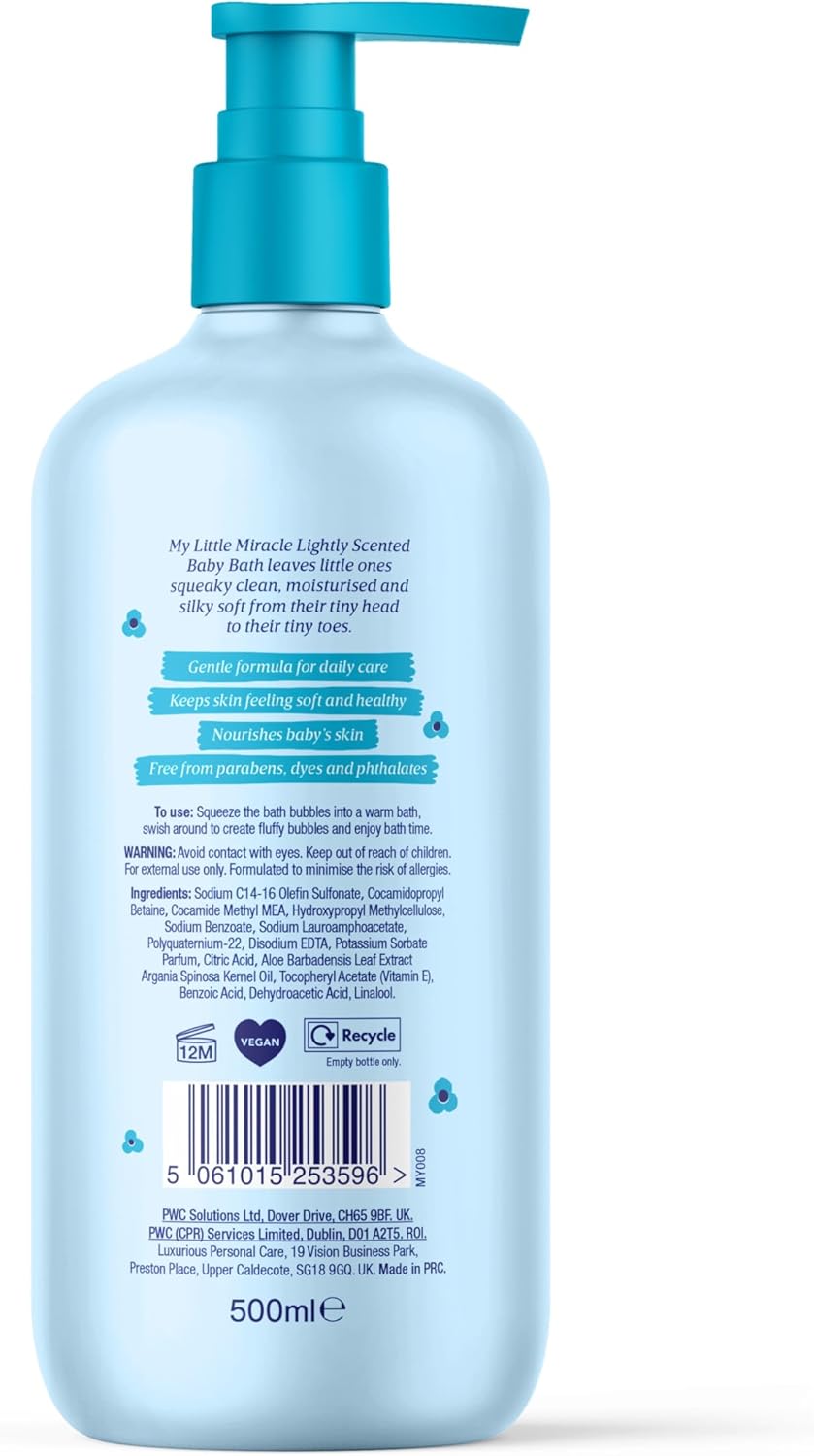 Transform bath time into a delightful experience with My Little Miracle Splashy Baby Bath. This gentle, daily care formula is specially designed for your little one's delicate skin, leaving them feeling fresh, clean, and wonderfully soft from head to toe. The lightly scented bath formula creates a soothing atmosphere whilst keeping your baby's skin moisturised and silky smooth. Crafted with care, this bath product is dermatologically tested and formulated without parabens, dyes, or phthalates, making it an ideal choice for daily bathing routines. The 500ml bottle contains everything you need to make bath time a cherished moment for both parent and child. Perfect for maintaining your baby's skin health whilst ensuring a thorough yet gentle cleanse, this bath formula provides the tender care your little miracle deserves,GENTLE FORMULA: Specially formulated for daily care of baby's delicate skin, keeping it clean and moisturised with every bath,DERMATOLOGICALLY TESTED: Carefully tested formula ensures it's suitable for your little one's sensitive skin,SKIN-FRIENDLY: Free from harsh chemicals including parabens, dyes and phthalates for gentle cleansing,MOISTURISING BENEFITS: Leaves baby's skin feeling soft, silky and healthy from head to toe,LIGHT FRAGRANCE: Delicately scented formula creates a pleasant bathing experience for your little one