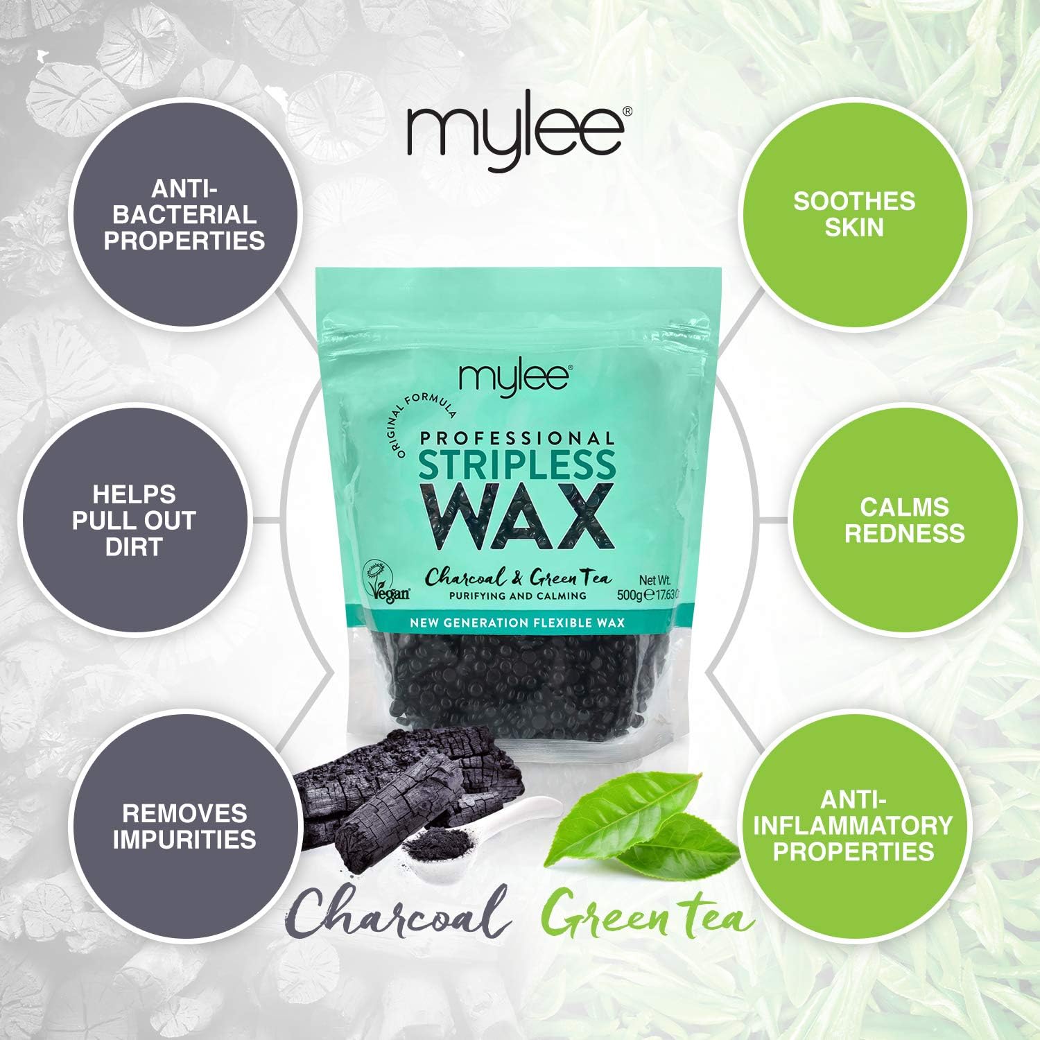 Mylee Professional Complete Waxing Kit With Wax Heater, Hard Wax Beads 500G, Applicator Spatulas, Pre & After Care Gel, Equipment Cleaner (Charcoal & Green Tea)