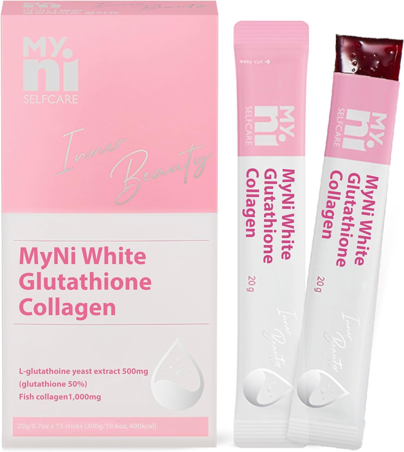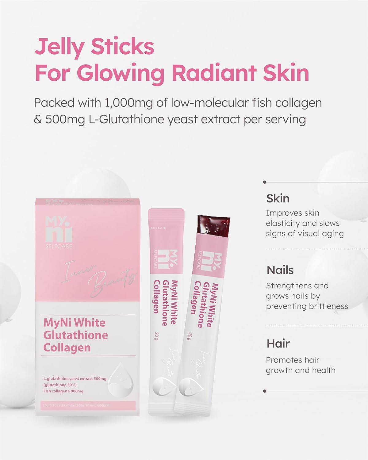 MYNI GLUTATHIONE COLLAGEN JELLY STICK (20g/0.7oz x 15 Sticks) - MyNi Glutathione Collagen is the key to radiant skin! Enjoy delicious sweet pomegranate jelly sticks packed withglutathione and collagen. Each stick contains 500mg of L-glutathione yeast extract and 1,000mg of fish collagen for 15 days of skin-loving benefits. Experience a more even and elastic complexion