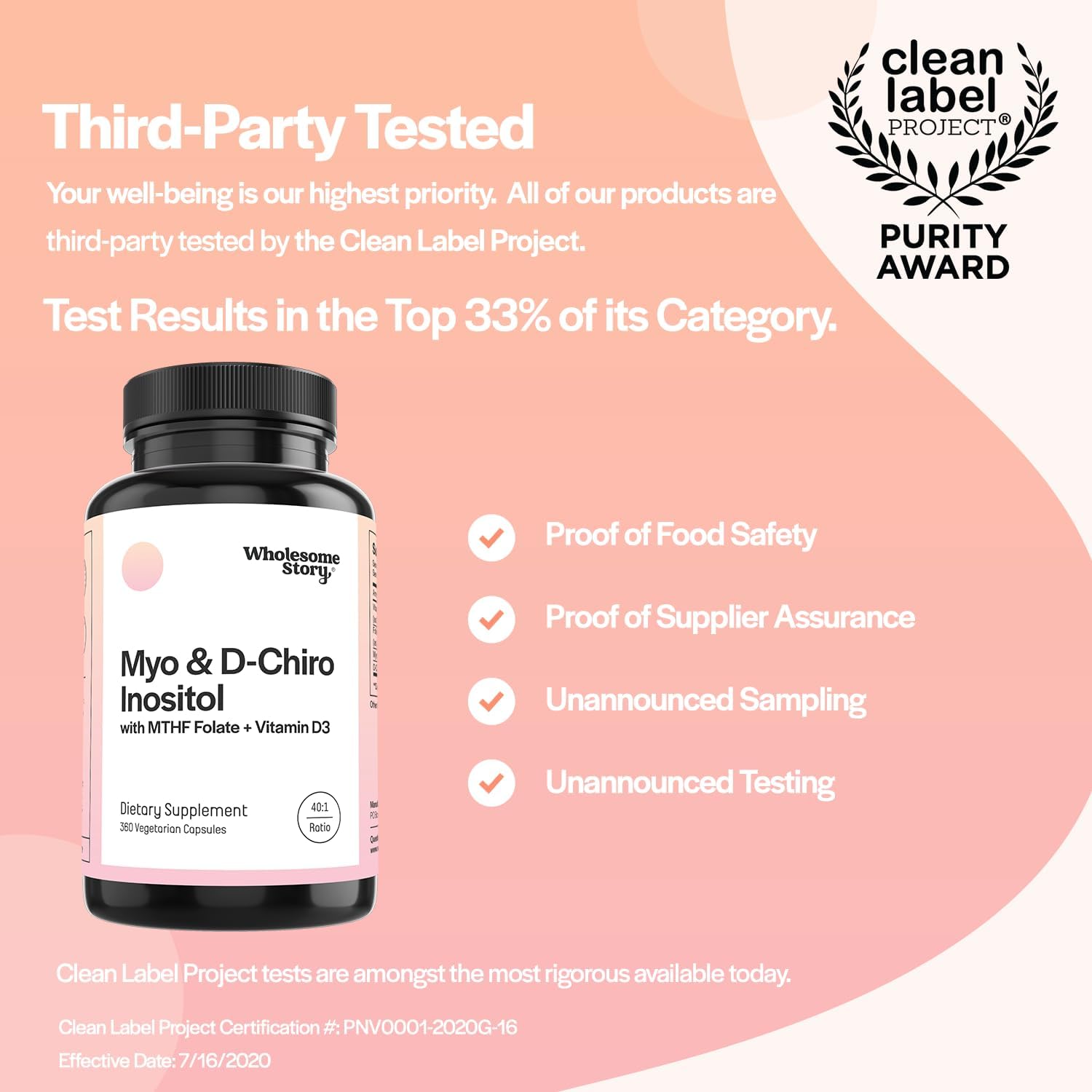 5 > Our Wholesome Promise: We are family-owned & proud to have our products 3P tested & certified by the Clean Label Project. We understand that each body and journey is unique. If our supplements don't work for you, let us know & we will make it right