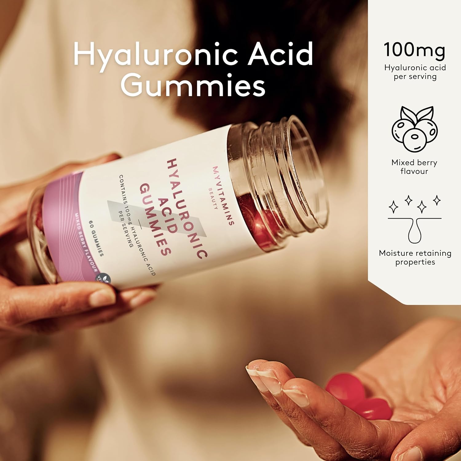 About this item Deep Hydration & Skin Elasticity – Each serving contains 100mg of hyaluronic acid, a powerful moisture-retaining molecule that helps keep your skin hydrated, smooth, and plump. As we age, natural hyaluronic acid levels decline, making supplementation essential for maintaining youthful skin. Supports Overall Skin Health – Hyaluronic acid plays a key role in skin regeneration, elasticity, and resilience. By retaining moisture, it helps reduce the appearance of dryness, fine lines, and dullness, promoting a healthy, radiant complexion from within. Delicious & Easy to Take – Say goodbye to hard-to-swallow capsules and messy powders. These convenient mixed berry-flavoured gummies make it easy to incorporate hyaluronic acid into your daily routine without hassle. Perfect for Active & Busy Lifestyles – Whether you're constantly on the move, managing a busy schedule, or simply looking for an effortless beauty boost, these gummies provide an easy way to stay consistent with your skincare routine. Premium Quality & Trusted Brand – Myprotein is committed to delivering high-quality supplements backed by science. These gummies are made with carefully selected ingredients to support your skin’s natural hydration, helping you look and feel your best every day. See more product details,Deep Hydration & Skin Elasticity – Each serving contains 100mg of hyaluronic acid, a powerful moisture-retaining molecule that helps keep your skin hydrated, smooth, and plump. As we age, natural hyaluronic acid levels decline, making supplementation essential for maintaining youthful skin,Supports Overall Skin Health – Hyaluronic acid plays a key role in skin regeneration, elasticity, and resilience. By retaining moisture, it helps reduce the appearance of dryness, fine lines, and dullness, promoting a healthy, radiant complexion from within,Delicious & Easy to Take – Say goodbye to hard-to-swallow capsules and messy powders. These convenient mixed berry-flavoured gummies make it easy to incorporate hyaluronic acid into your daily routine without hassle,Perfect for Active & Busy Lifestyles – Whether you're constantly on the move, managing a busy schedule, or simply looking for an effortless beauty boost, these gummies provide an easy way to stay consistent with your skincare routine,Premium Quality & Trusted Brand – Myprotein is committed to delivering high-quality supplements backed by science. These gummies are made with carefully selected ingredients to support your skin’s natural hydration, helping you look and feel your best every day