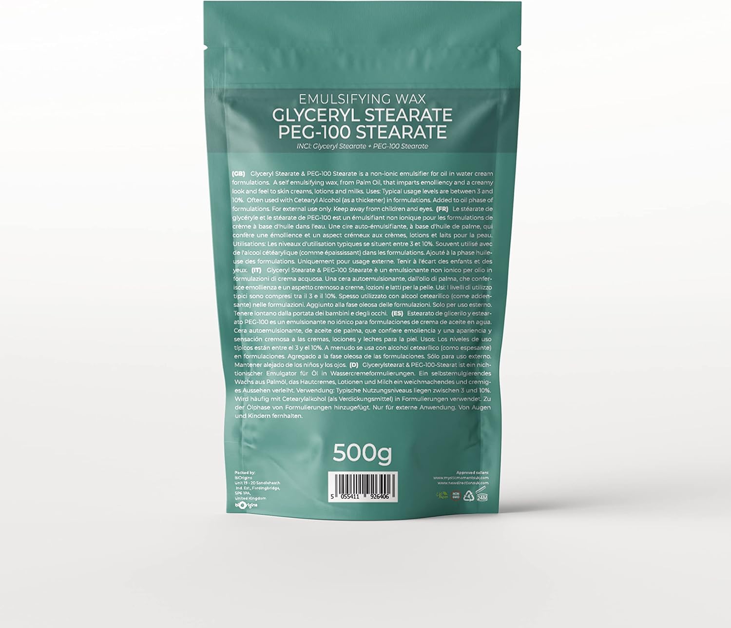 Glyceryl Stearate & PEG-100 Stearate Emulsifying Wax 100g Description: A self emulsifying wax, from Palm Oil, that imparts emolliency and a creamy look and feel to skin creams, lotions and milks. Glyceryl Stearate & PEG-100 Stearate is a non-ionic emulsifier for oil in water cream formulations. Typical usage levels are between 3 and 10% Often used with cetearyl alcohol (as a thickener) in formulations. Added to oil phase of formulations. Do not consume. For external use only. Keep away from children and eyes