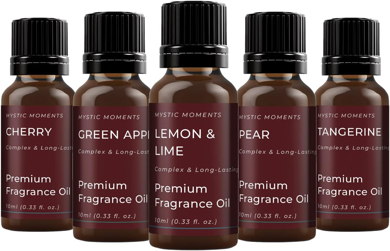 Consists of 5x10ml Bottles of Premium fragrance Oils Cherry, Green Apple, Lemon-Lime, Pear, Tangerine