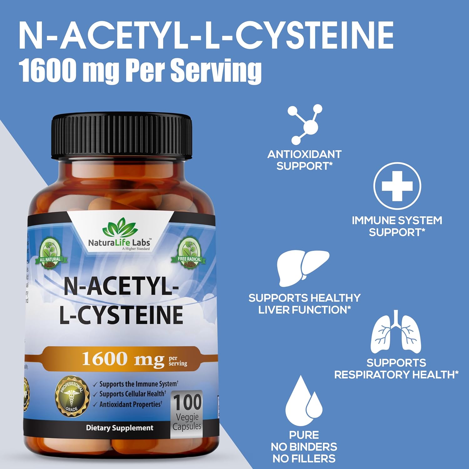 N-Acetyl-L-Cysteine (Nac) 1600 Mg Lung Health & Immune Support, Liver Support & Antioxidants*, Free-Radicals, Free Form - 100 Veggie Capsules