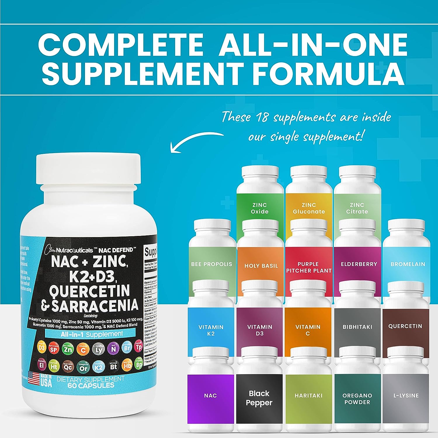 BULLET POINTS : 1 > Advanced NAC 1000mg Supplement For Women and Men - Our Nac Supplements and Vitamin K2 D3 includes 19 ingredients such as Zinc Supplements, Quercetin Supplements, Sarracenia Purpurea Extract and more! N Acetyl Cysteine with a K2 D3 Vitamin Supplement have been combined and the results are amazing. Clean Nutra has officially created the worldâs most inclusive 19 in 1 Zinc With Quercetin Supplement, Vitamin D3 with K2, Saracina Purpurea and NAC N-Acetyl Cysteine capsules