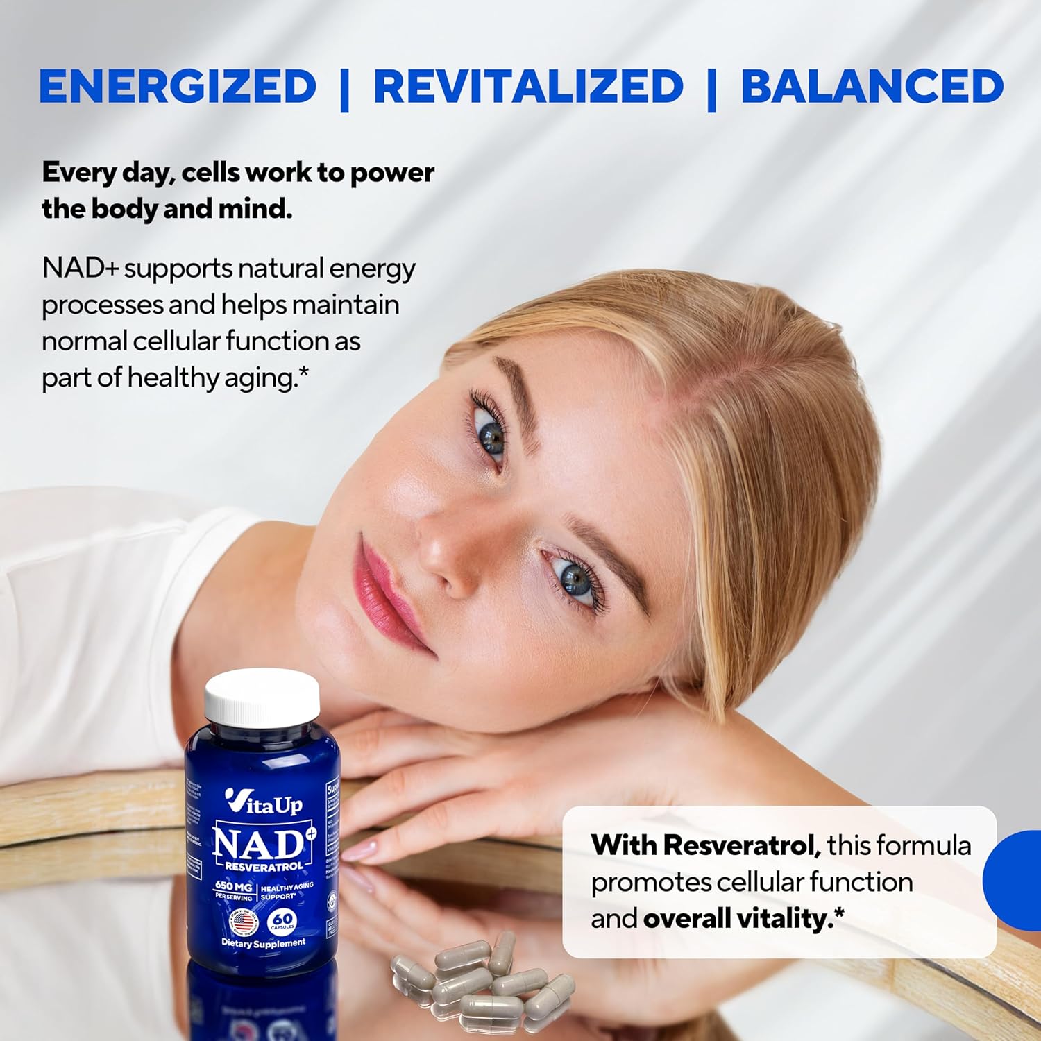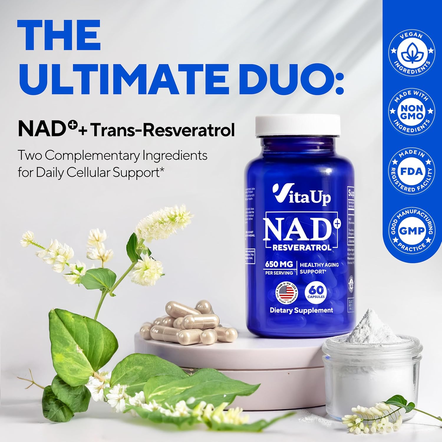 About this item ULTIMATE DUO: Unlock the power of our NAD+ supplement formula, enriched with trans-resveratrol. These two synergistic ingredients are designed to support overall cellular health and vitality. Enjoy the benefits in just 2 capsules daily.* HEALTHY AGING: VitaUp NAD+ supplements for women and men are thoughtfully formulated to support the healthy aging process. By promoting cellular repair and maintenance, they help you stay active, feel balanced, and maintain vitality over time.* ENERGY SUPPORT: NAD+ plays a vital role in cellular energy production. Combined with trans-resveratrol, our formula supports normal energy metabolism.* COGNITIVE & IMMUNE SUPPORT: Our NAD+ complex supports normal cognitive and immune function. By sustaining normal NAD+ levels, it helps promote focus and contributes to immune system balance.* GMP CERTIFIED: Manufactured in an FDA-registered facility, VitaUp NAD+ capsules meet all required GMP standards. Each batch of our NAD+ pills undergoes third-party lab testing for purity and potency. We do not use any GMOs, gluten, preservatives, or sweeteners.* See more product details,ULTIMATE DUO: Unlock the power of our NAD+ supplement formula, enriched with trans-resveratrol. These two synergistic ingredients are designed to support overall cellular health and vitality. Enjoy the benefits in just 2 capsules daily,HEALTHY AGING: VitaUp NAD+ supplements for women and men are thoughtfully formulated to support the healthy aging process. By promoting cellular repair and maintenance, they help you stay active, feel balanced, and maintain vitality over time,ENERGY SUPPORT: NAD+ plays a vital role in cellular energy production. Combined with trans-resveratrol, our formula supports normal energy metabolism,COGNITIVE & IMMUNE SUPPORT: Our NAD+ complex supports normal cognitive and immune function. By sustaining normal NAD+ levels, it helps promote focus and contributes to immune system balance,GMP CERTIFIED: Manufactured in an FDA-registered facility, VitaUp NAD+ capsules meet all required GMP standards. Each batch of our NAD+ pills undergoes third-party lab testing for purity and potency. We do not use any GMOs, gluten, preservatives, or sweeteners