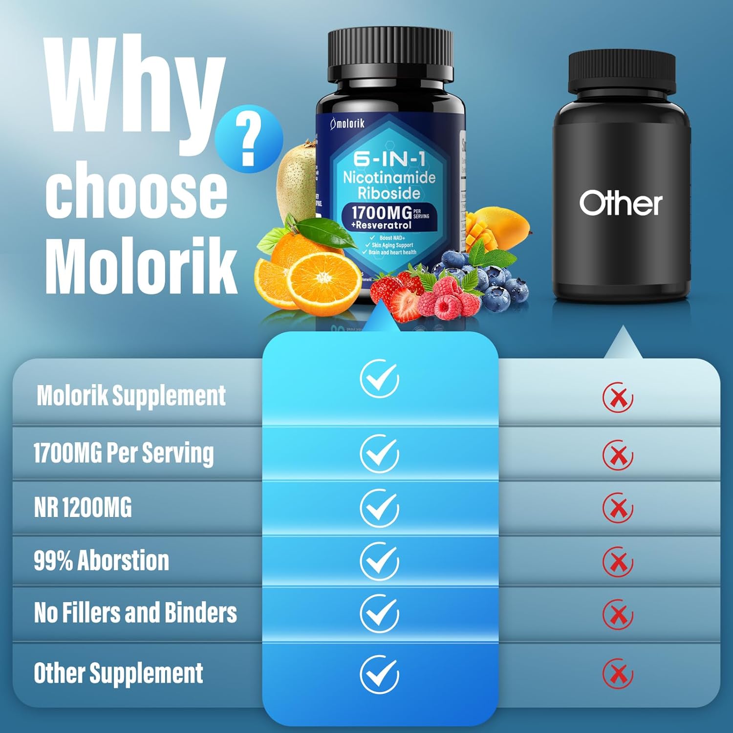 About this item ?Powerful Antioxidant?Each serving contains 1200mg Nicotinamide Riboside NAD Supplement, 100mg Trans-Resveratrol (powerful antioxidant), 100mg Quercetin Phytocomplex (enhances immune function), and 100mg TMG (enhances liver function) to help you maintain abundant energy and clear thinking. ?NAD+ Supplement?NAD+ is important to the human body's anti-aging and immune system support. As NAD+ levels gradually decrease with age, taking Nicotinamide Riboside Supplements can enhance NAD+ levels in the human body, which helps improve physical function, resist aging, and promote longevity. ?Improve Skin Condition?Nicotinamide Riboside promotes skin cell regeneration and repair and enhances skin barrier function by increasing NAD+ content. The antioxidant effect of NAD+ also helps to fade fine lines and wrinkles and keep your skin healthy and vibrant. ?Enhance Cell Metabolism and Function?Nicotinamide Riboside can support the metabolic process of cells and enhance the efficiency of cell energy utilization after increasing NAD+ levels, providing strong support for daily life. ?Safe and Effective?Each capsule provided by molorik is guaranteed to be safely produced, GMP verified and tested by a third-party laboratory. It is gluten-free, free of additional additives and artificial flavors. โบ See more product details,?Powerful Antioxidant?Each serving contains 1200mg Nicotinamide Riboside NAD Supplement, 100mg Trans-Resveratrol (powerful antioxidant), 100mg Quercetin Phytocomplex (enhances immune function), and 100mg TMG (enhances liver function) to help you maintain abundant energy and clear thinking,?NAD+ Supplement?NAD+ is important to the human body's anti-aging and immune system support. As NAD+ levels gradually decrease with age, taking Nicotinamide Riboside Supplements can enhance NAD+ levels in the human body, which helps improve physical function, resist aging, and promote longevity,?Improve Skin Condition?Nicotinamide Riboside promotes skin cell regeneration and repair and enhances skin barrier function by increasing NAD+ content. The antioxidant effect of NAD+ also helps to fade fine lines and wrinkles and keep your skin healthy and vibrant,?Enhance Cell Metabolism and Function?Nicotinamide Riboside can support the metabolic process of cells and enhance the efficiency of cell energy utilization after increasing NAD+ levels, providing strong support for daily life,?Safe and Effective?Each capsule provided by molorik is guaranteed to be safely produced, GMP verified and tested by a third-party laboratory. It is gluten-free, free of additional additives and artificial flavors