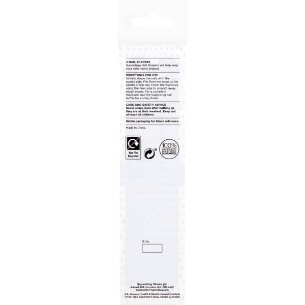 Product Information:Superdrug Nail Shapers Will Keep Your Nails Neatly Shaped,Warning Or Restrictions:Never Shape Nails After Bathing As They Are At Their Weakest. Keep Out Of Reach Of Children,Product Specification:Product Code: 785404,Product Uses:Initially Shape The Nails With The Coarse Side. File From The Edge To The Centre Of The Nail. Finish The Manicure Using The Finer Side To Smooth Away Rough Edges. For A Complete Manicure, Use The Superdrug Nail Buffer For A Shiny Finish