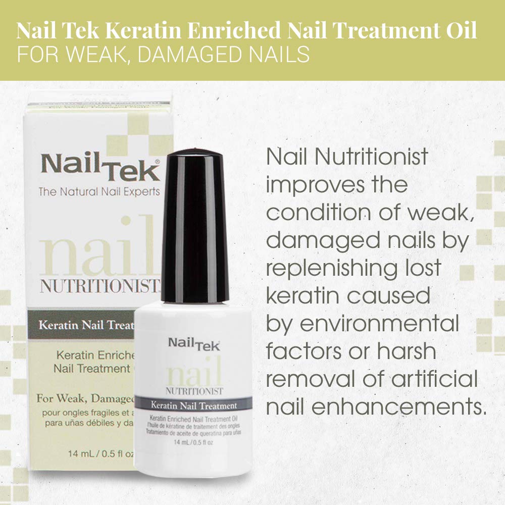 About this item Repair & Nourish Damaged Nails: Nail Tek Nutritionist is a powerful nail treatment oil that absorbs into soft, weak nail layers to give them maximum strength, stopping peeling and chipping. The next revolution in nail repair. Keratin-Enriched Nail Treatment: Formulated with keratin protein to provide nails the essential nutrients needed to grow strong, long, and healthy. It works great in treating nails after removing artificial nails and gel polish. Strengthens & Conditions Nails: Its rich ingredients form a barrier against harsh environmental factors, conditioning your nails. Also made to reverse that nail damage, so you can enjoy using acrylic nails while taking care of your natural nails. Grow Strong, Long, and Healthy Nails: This promotes healthy nail growth, shine and glow while delivering naturally improved nail results that you can work with any time, any day. Enjoy constant manicures or pedicures without worrying about the health of your nails! Award-Winning Nail Therapy & Made in the USA: Nail Tek has been voted as āBest Natural Nail Treatmentā by Salon Professionals! This pro-approved nail treatment oil is 100% cruelty-free, DBP-free, and Toluene-free making it safe and protects natural nails from damage. See more product details,Repair & Nourish Damaged Nails: Nail Tek Nutritionist is a powerful nail treatment oil that absorbs into soft, weak nail layers to give them maximum strength, stopping peeling and chipping. The next revolution in nail repair,Keratin-Enriched Nail Treatment: Formulated with keratin protein to provide nails the essential nutrients needed to grow strong, long, and healthy. It works great in treating nails after removing artificial nails and gel polish,Strengthens & Conditions Nails: Its rich ingredients form a barrier against harsh environmental factors, conditioning your nails. Also made to reverse that nail damage, so you can enjoy using acrylic nails while taking care of your natural nails,Grow Strong, Long, and Healthy Nails: This promotes healthy nail growth, shine and glow while delivering naturally improved nail results that you can work with any time, any day. Enjoy constant manicures or pedicures without worrying about the health of your nails!,Award-Winning Nail Therapy & Made in the USA: Nail Tek has been voted as āBest Natural Nail Treatmentā by Salon Professionals! This pro-approved nail treatment oil is 100% cruelty-free, DBP-free, and Toluene-free making it safe and protects natural nails from damage