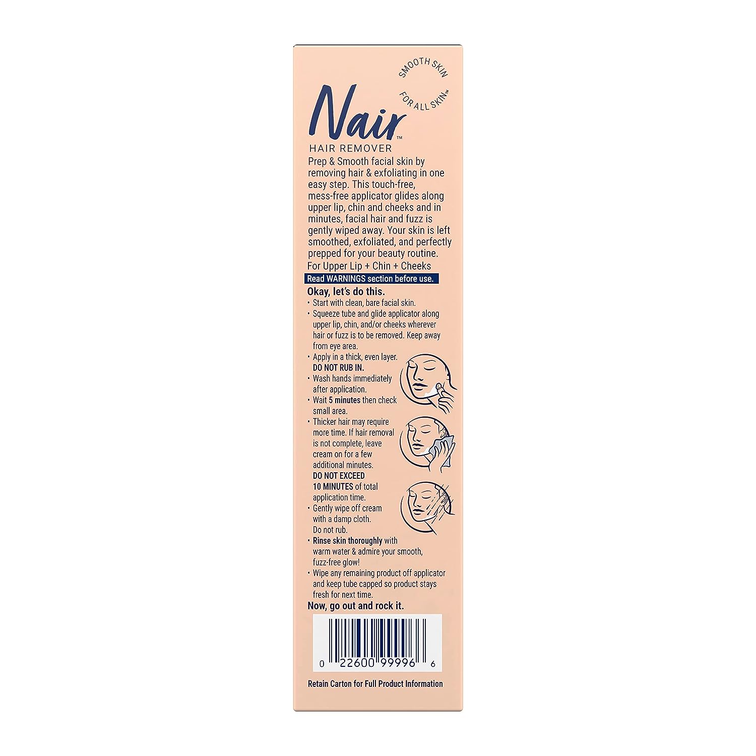 Our 1 step formula for creating the perfect canvas doe skincare and makeup application. Nair Prep & Smooth Face is the easy, touch-free, mess-free way to exfoliate your skin and remove your fuzz. Infused with skin loving ingredients and featuring an ergonomic applicator, this revolutionary formula is here to transform your derma planning routine. So you can ditch the blades and enjoy long-lasting, smooth, simply stunning skin!Facial hair remover for women infused with hydrating coconut milk and collagen for sensitive skinTouch-free, mess-free application for use along upper lip, chin, and cheeks wherever hair or fuzz is to be removedGently wipe away facial fuzz while cream smooths and exfoliates skin so you can ditch the blades and enjoy long-lasting, smooth, simply stunning skin!This sensitive formula has an incredible coconut scent