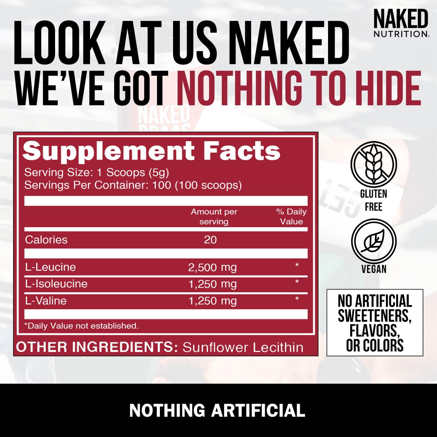 Naked Bcaas Amino Acids Powder, Only 1 Ingredient, Pure 2:1:1 Formula, Vegan Unflavored Branched Chain Amino Acids, Instantized All Natural Bcaa Supplement - 500 Grams, 100 Servings
