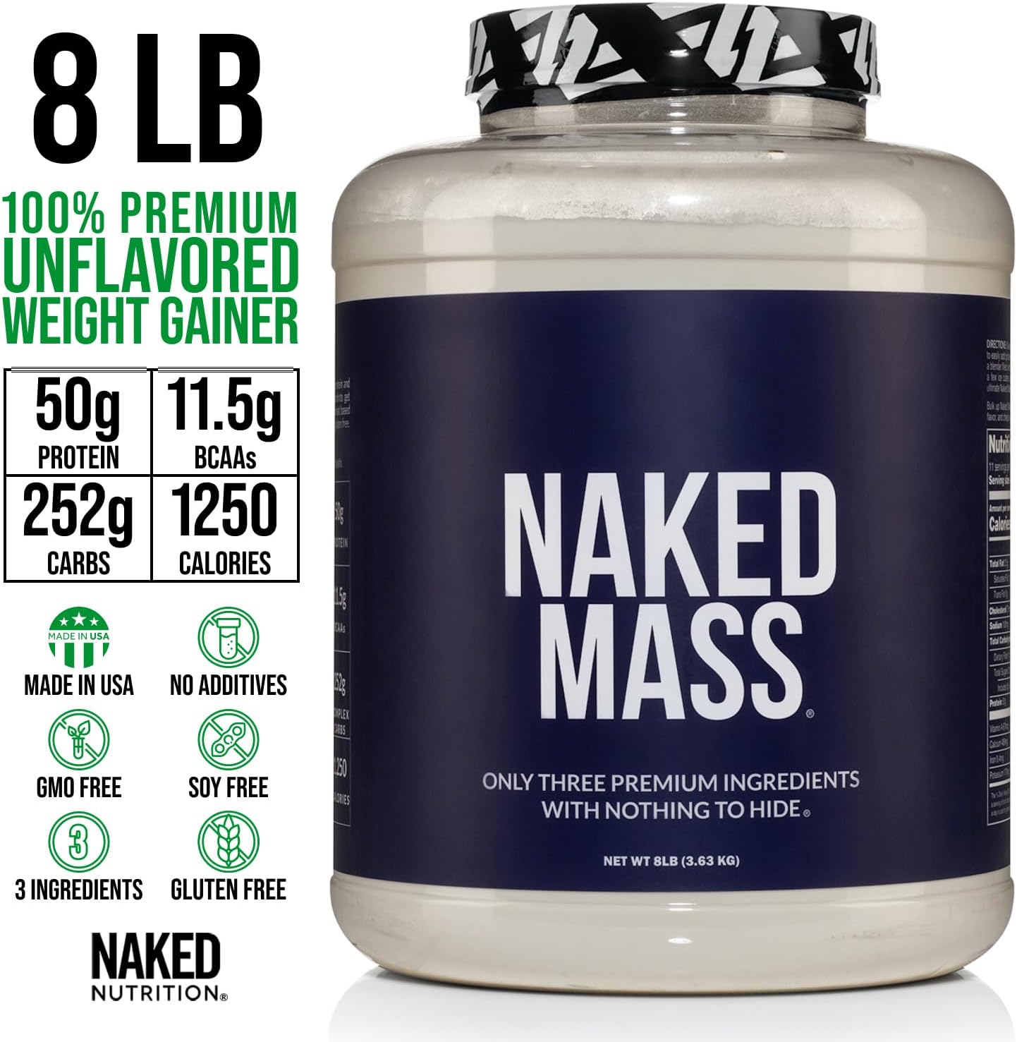 Naked Mass - Natural Weight Gainer Protein Powder - 8 Lb Bulk, Gmo Free, Gluten Free & Soy Free. No Artificial Ingredients - 1,250 Calories Per Serving