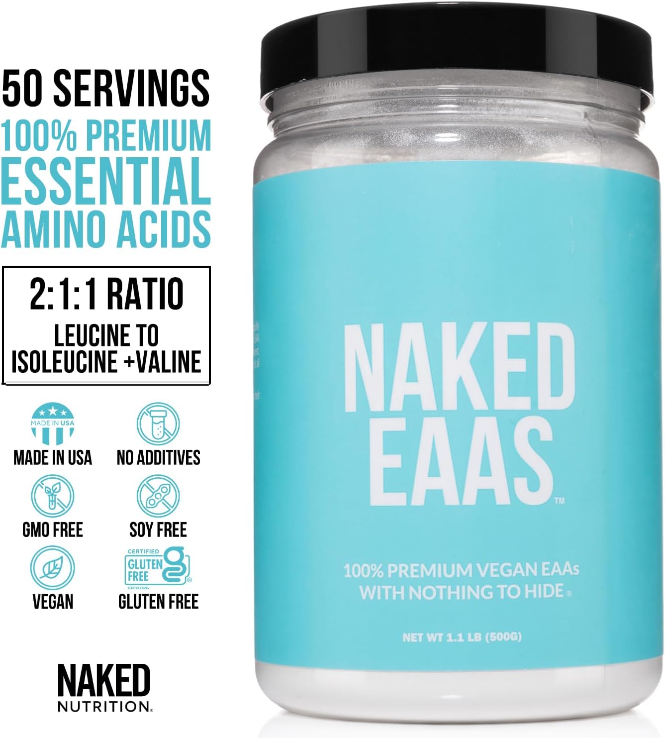 PURE ESSENTIAL AMINO ACIDS: Naked EAAs is the highest pharmaceutical grade and fastest dissolving amino acids powder on the market. With pure ingredients, our amino acid supplement has been designed to support your performance in the gymTHE PERFECT FORMULA: Our essential amino acids supplement contains a 2:1:1 formula to enhance energy and assist post-workout recovery. Each serving provides 2.4g l-Leucine, 1.2g l-Isoleucine and 1.2g l-Valine, which studies have shown to be the most effective formulationENHANCE PERFORMANCE: Essential amino acids play a vital role in workout endurance and post-workout recovery by increasing protein synthesis. Supplementing with an amino acid complex provides the energy and nutrition needed to achieve peak performanceVEGAN AMINO ACIDS SUPPLEMENT: GMO Free, Soy Free, Certified Gluten-Free, and Vegan. Our EAAs amino acids powder can help you reach your full potential at any fitness level. Contains no artificial sweeteners, flavors, or colorsACHIEVE YOUR FITNESS GOALS: Add two scoops of our amino acid powder to a drink of your choice before training to optimize your gym performance and workout gains