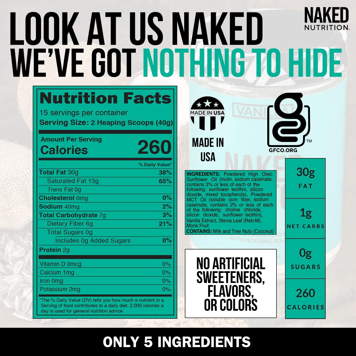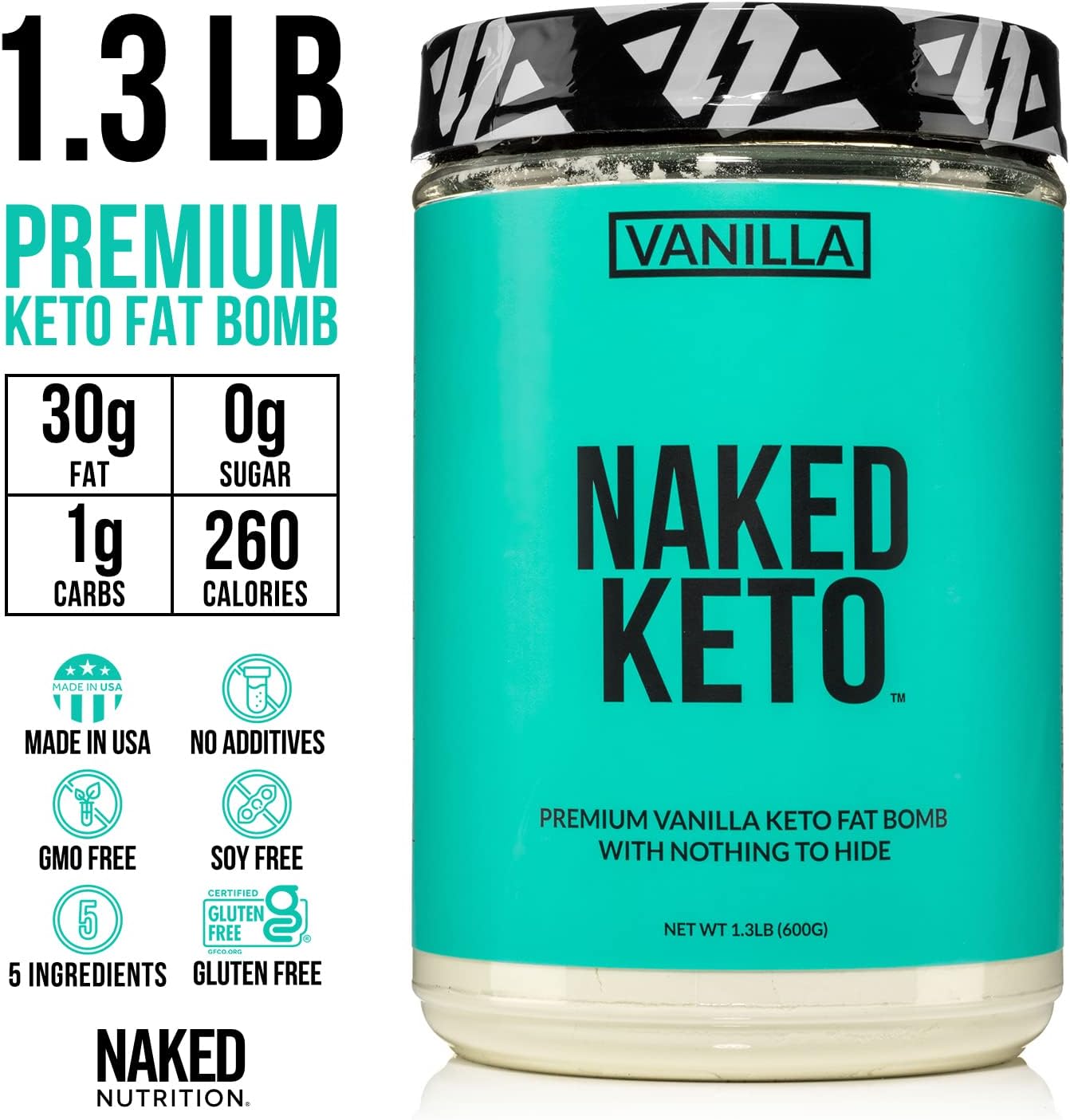 ONLY 5 INGREDIENTS: High Oleic Powdered Sunflower Oil, Powdered MCT Oil, Vanilla Extract, Stevia, and Monk Fruit. Our keto bomb does not contain any artificial flavors, sweeteners, or colors, and is GMO-Free, Gluten-Free and Soy-FreeBEST INGREDIENTS: Both the High Oleic Sunflower Oil and MCT Oil contained in Naked Keto are made in the USA as to ensure maximum quality. Our keto supplement is perfect for supporting a low-carb dietHEALTH BENEFITS: Our keto powder can work to improve your health by providing healthy fats for your body to use as energy. This will help you maintain a low carb lifestyle without consuming unhealthy saturated fatsOPTIMUM NUTRITION: 30g of fat, 1g of net carbs, 0g of sugar at 260 calories per serving. Naked Keto contains no hidden additives or unnecessary ingredientsTHE IDEAL KETO SUPPLEMENT: Our keto bomb powder makes for the ideal keto supplement for those on a low-carb diet. Simply mix two scoops of Naked Keto into your preferred beverage and enjoy an easy keto fat bomb