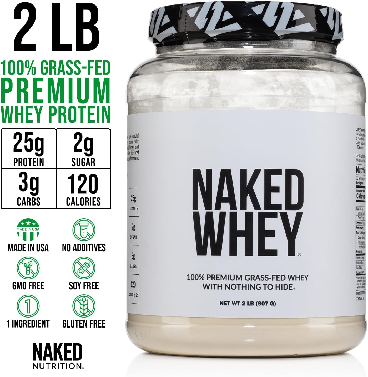 Naked Whey 2Lb 100% Grass Fed Whey Protein Powder - Only 1 Ingredient, Unflavored Whey Protein, Undenatured, Gluten Free, Soy Free, No Gmos, No Preservatives