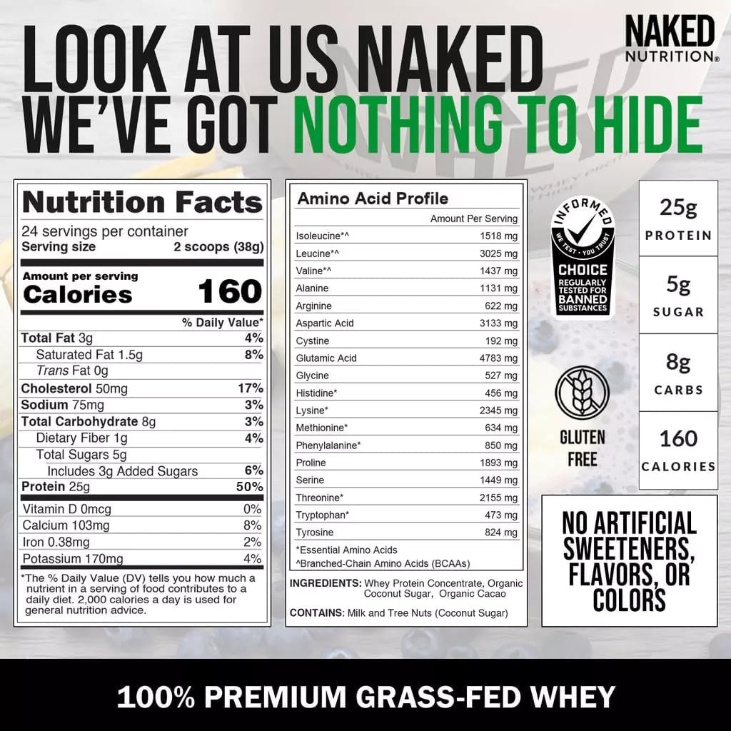 Only Three Ingredients: 100% Grass Fed Pure Whey Protein, Organic Chocolate, And Organic Coconut Sugar. Naked Chocolate Whey Contains No Artificial Sweeteners Or Colors And Is Gmo-Free, Soy Free And Gluten-Free