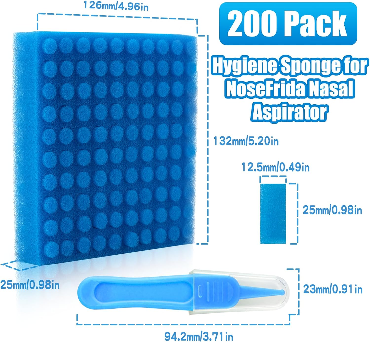 Package Included200PCS Nasal aspirator hygiene sponges and 1PC nose cleaning tweezer, compatible with NoseFrida nasal aspirator or other similar brands10Safe & EnvironmentalMade from high-quality materials, making it safe for your baby's delicate nasal passages10Key FunctionIts multiple fine holes design ensures a fast and strong water permeability effect, restoring your little baby's breathing smoothly10Easy Clean-Up Just simply need to change with a new one, and then the nasal aspirator will back to work. Throw away after use, hygiene, and cleanliness10Nose Cleaning TweezerUnique handle and round-head design, ensure safety during use, and maximum control and precision