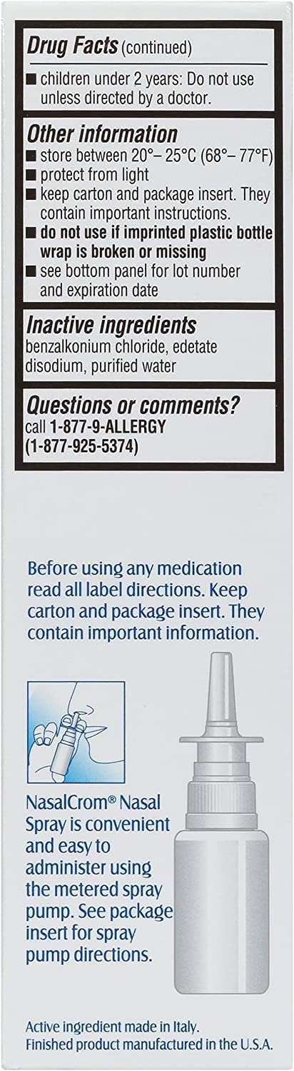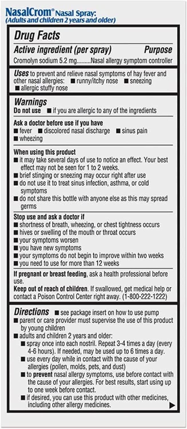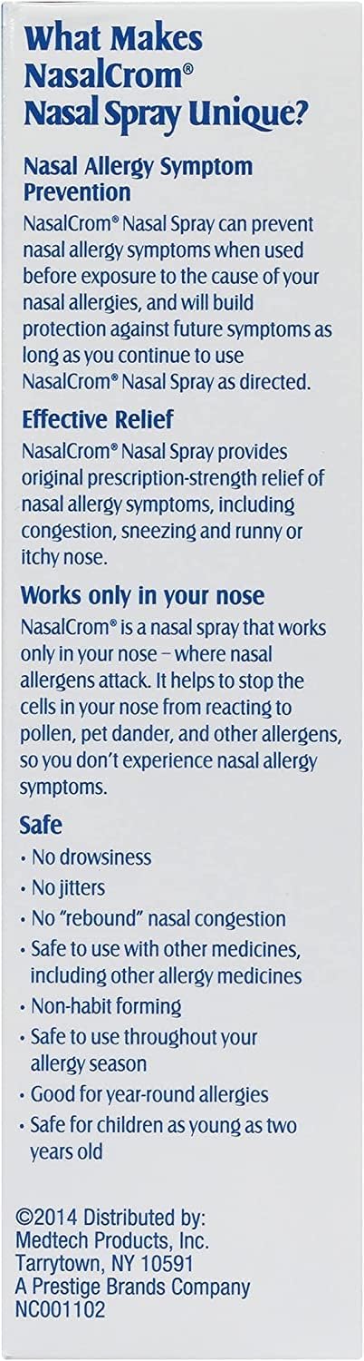 Suffer from nasal allergies We're all about allergy symptom prevention. NasalCrom works differently from other over-the-counter allergy products and brings relief from chronic allergy symptoms before they begin. When used before exposure to many common allergens, NasalCrom can prevent the onset of nasal allergy attacks and build protection against future symptoms as long as you continue to use it as directed. It contains no steroids and is safe to use with other allergy medications. NasalCrom does not cause drowsiness or jitters, plus it is non-habit forming. NasalCrom is safe for kids ages two and up. To enjoy the full preventative power of NasalCrom, it's important to note that you should start using it a week or two before you expect to encounter problematic allergens. Fortunately, NasalCrom will still provide relief while it builds up full protection against further symptoms,Relieves allergy symptoms, including runny/itchy nose, sneezing, allergic stuffy nose,Prevents and controls nasal allergy symptoms from occurring in the first place; 200 Sprays included,No drowsiness or jitters, plus it is non habit forming,No steroids; safe to use with other allergy medications,Safe for kids ages two and up