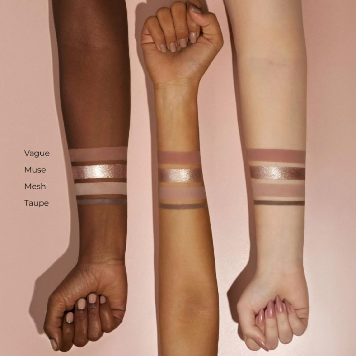 The I NEED A NUDE Baby Palette features Muse, a champagne Sparkling Foiled shade, paired with Vague, a medium dusty rose hue and Mesh, a light taupe, both in the Creamy Matte finish