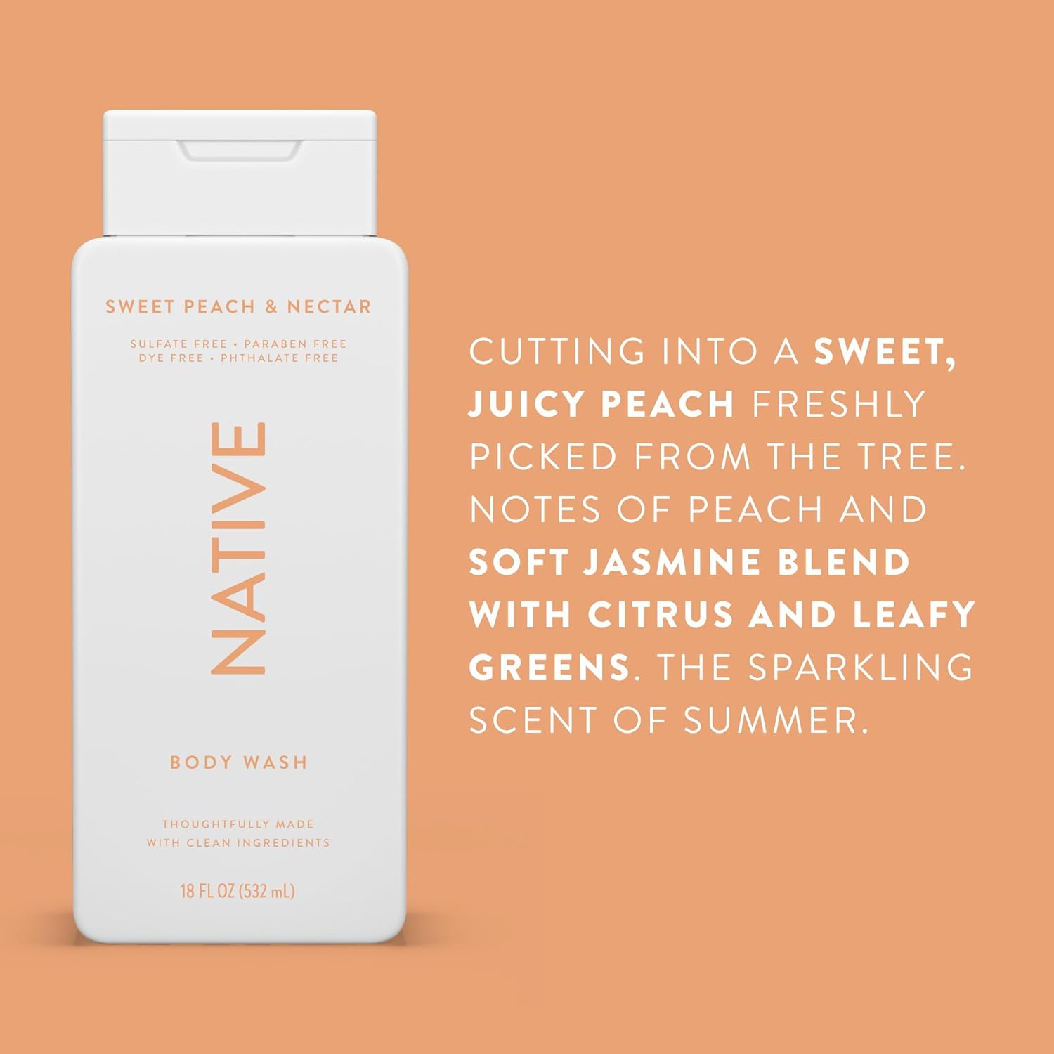 About this item Clean Ingredients - Native body wash contains naturally derived ingredients. We also use both safe, synthetic, sustainable fragrances (free of phthalates) and natural fragrances. Clean Scents - Our aromatic scents turn the routine task of showering or bathing into a memorable and luxurious experience. It's the little things in life. Soft Skin Feeling - Lovingly made with cleansers derived from coconut oil to leave your skin feeling hydrated. Transporting you to your own private white sand beach, the Native Body Wash is both sweet and sophisticated. Vegan & Cruelty Free - Our body wash is free of SLS, SLES & phthalates. Pick Your Favorite Scents - The only thing left to do is pick your favorite bath or shower time scents for a clean, refreshing, natural wash. See more product details,Clean Ingredients - Native body wash contains naturally derived ingredients. We also use both safe, synthetic, sustainable fragrances (free of phthalates) and natural fragrances,Clean Scents - Our aromatic scents turn the routine task of showering or bathing into a memorable and luxurious experience. It's the little things in life,Soft Skin Feeling - Lovingly made with cleansers derived from coconut oil to leave your skin feeling hydrated. Transporting you to your own private white sand beach, the Native Body Wash is both sweet and sophisticated,Vegan & Cruelty Free - Our body wash is free of SLS, SLES & phthalates,Pick Your Favorite Scents - The only thing left to do is pick your favorite bath or shower time scents for a clean, refreshing, natural wash