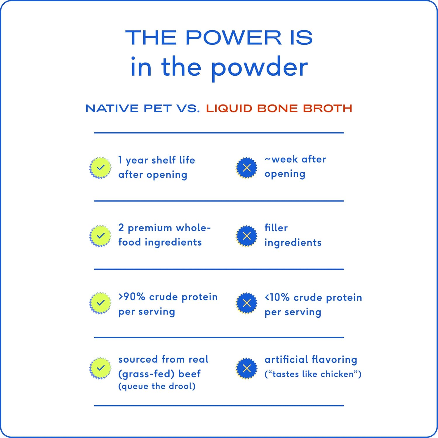 FOOD TOPPER FOR PICKY EATERS | Use Native Pet’s bone broth as a food topper. Sprinkle the bone broth powder on dry dog food, use it as a dog food gravy, or use it as a dog food seasoning. The pickiest dogs won’t resist this dog bone broth