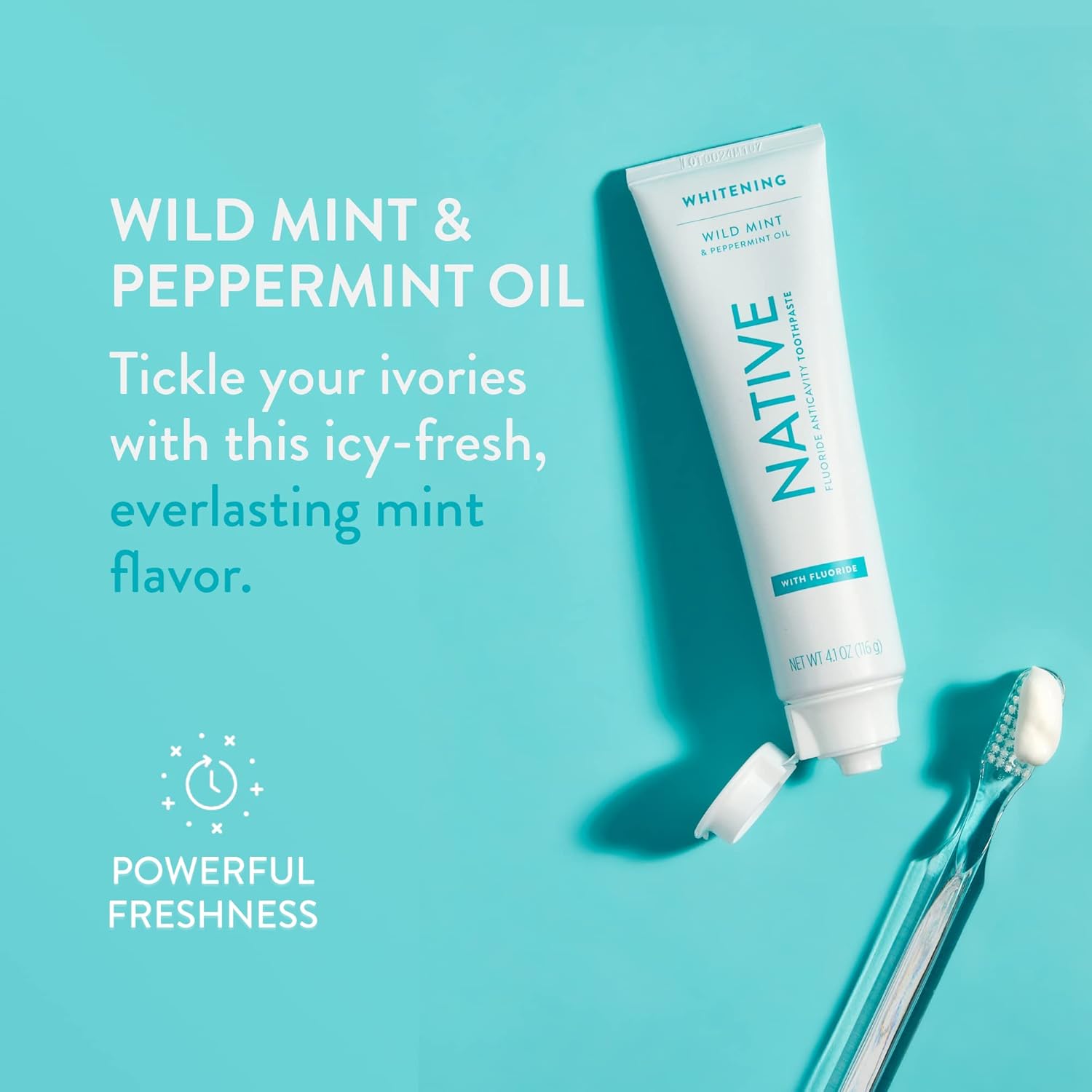 About this item Fluoride Anticavity Toothpaste - Formulated with fluoride to fight cavities in Adults and Children. Simple Ingredients - Made without ingredients like parabens, sulfates (SLS and SLES), triclosan, and artificial preservatives. Our toothpaste is made with naturally-derived cleansers and simple ingredients that performs like a pro: safely whitens teeth, dishes out a rich foam and offers relentless freshness. Fresh Flavors - Flavored with a plant-derived sweeteners that ensures Native toothpaste tastes great and helps prevent tooth decay. Responsibility - Never tested on animals, only humans who volunteer. Use every day for whiter teeth, fresher breath, a brighter smile, and a better day. Whitens teeth, freshens breath, and fights cavities See more product details,Fluoride Anticavity Toothpaste - Formulated with fluoride to fight cavities in Adults and Children,Simple Ingredients - Made without ingredients like parabens, sulfates (SLS and SLES), triclosan, and artificial preservatives. Our toothpaste is made with naturally-derived cleansers and simple ingredients that performs like a pro: safely whitens teeth, dishes out a rich foam and offers relentless freshness,Fresh Flavors - Flavored with a plant-derived sweeteners that ensures Native toothpaste tastes great and helps prevent tooth decay,Responsibility - Never tested on animals, only humans who volunteer. Use every day for whiter teeth, fresher breath, a brighter smile, and a better day,Whitens teeth, freshens breath, and fights cavities