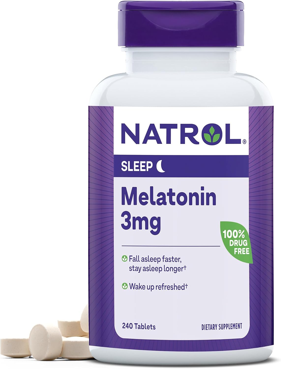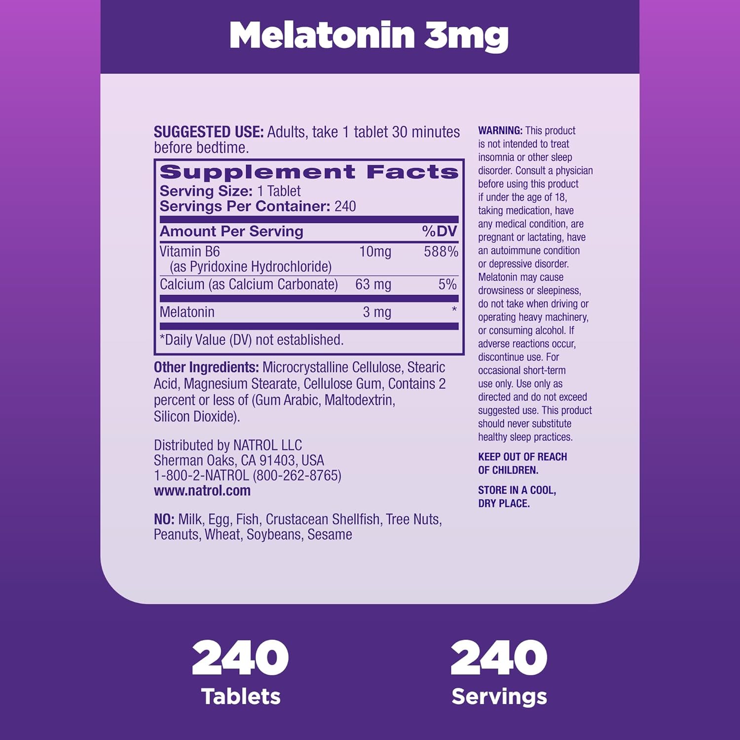 Natrol 3Mg Melatonin Sleep Aid Tablets, Fall Asleep Faster, Stay Asleep Longer, 99% Pure Melatonin, Dietary Supplement, 240 Count