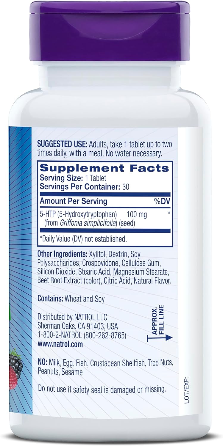 Product Description Natrol 5-HTP 100mg Tablets are a 100% drug-free way to help support a balanced mood.* Sourced from high-quality, Non-GMO ingredients, this dietary supplement contains no artificial flavors or synthetic dyes. These easy-to-take tablets are also vegetarian and contain no milk, egg, fish, crustacean shellfish, tree nuts, peanuts or sesame. 5-HTP is a naturally occurring amino acid that promotes the production of serotonin.* These great-tasting mixed berry-flavored tablets dissolve quickly, allowing you to take them anytime, anywhere, and without water. Adults, take one 5-HTP fast dissolve tablet up to twice daily with a meal. No water necessary. Natrol is the #1 5-HTP brand in America and one of the nations leading manufacturers of vitamins and supplements. (1)(1) Nielsen, xAOC, 52 weeks ending 02/24/24, 5-HTP Brand Story By Natrol