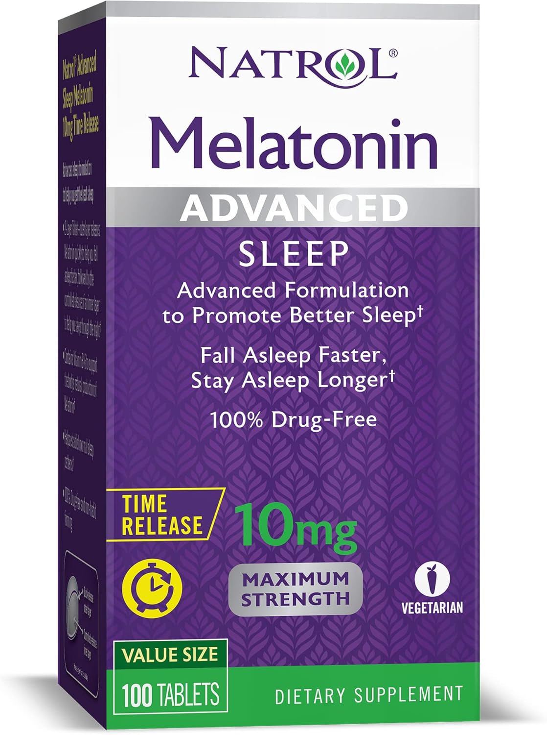 Natrol Advanced Sleep Melatonin 10mg is a dietary supplement that helps promote better sleep with an advanced formula to help you fall asleep faster and stay asleep for longer. Sourced from high-quality ingredients and 100% drug-free, this Melatonin sleep aid supplement contains no synthetic dyes, artificial flavors, sweeteners, or preservatives. This sleep support supplement is also vegetarian, containing no milk, egg, fish, crustacean shellfish, tree nuts, peanuts, wheat, soybeans or sesame. Melatonin is a hormone that helps regulate the body's sleep and wake cycles which can be affected by age, everyday stress and diet choices induced by busy lifestyles. This Natrol Melatonin supplement can help with occasional sleeplessness. Each easy-to-take tablet comes with a 2 Layer tablet, Controlled Release tablet. Melatonin dissolving outer layer releases quickly to help you fall asleep faster and a controlled release inner layer helps you sleep through the night. This nighttime sleep aid supplement formula combines Melatonin with 10mg of Vitamin B6 to support the body's natural production of Melatonin, and 23mg of Calcium. Adults, take one Melatonin tablet 30 minutes before bedtime. Break the sleep stress cycle with Natrol, the #1 drug-free sleep aid brand