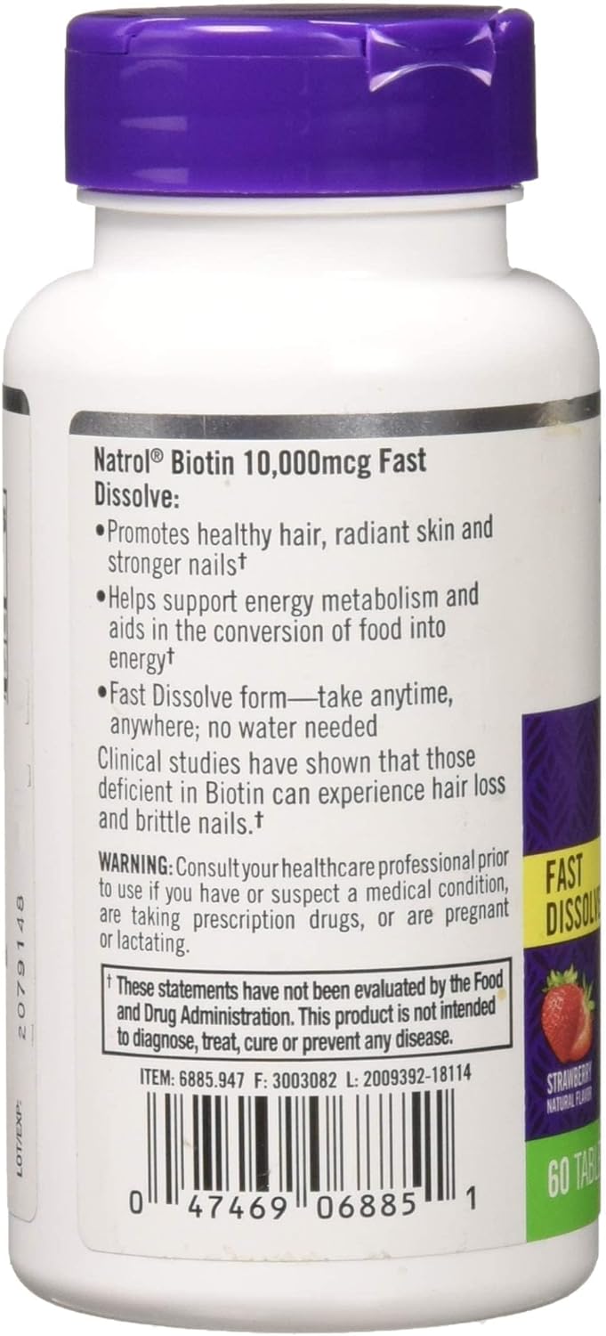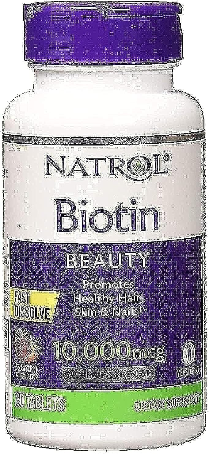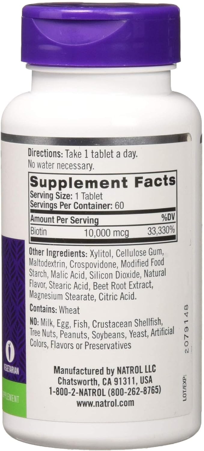 Natrol Biotin Description: Maximum Strength Promotes Healthy Hair and Strong Nails Supports Cellular Energy Production Biotin is an important B-vitamin that provides dietary support for healthy hair and nails as well as energy production. By supporting the matrix of hair and nails, Biotin promotes shiny, lustrous hair and strong, resilient nails. Free Of Yeast, but contains wheat, corn, milk, egg, soy, glutens, artificial colors and flavors, added sugar, starch and preservatives. Disclaimer These statements have not been evaluated by the FDA. These products are not intended to diagnose, treat, cure, or prevent any disease