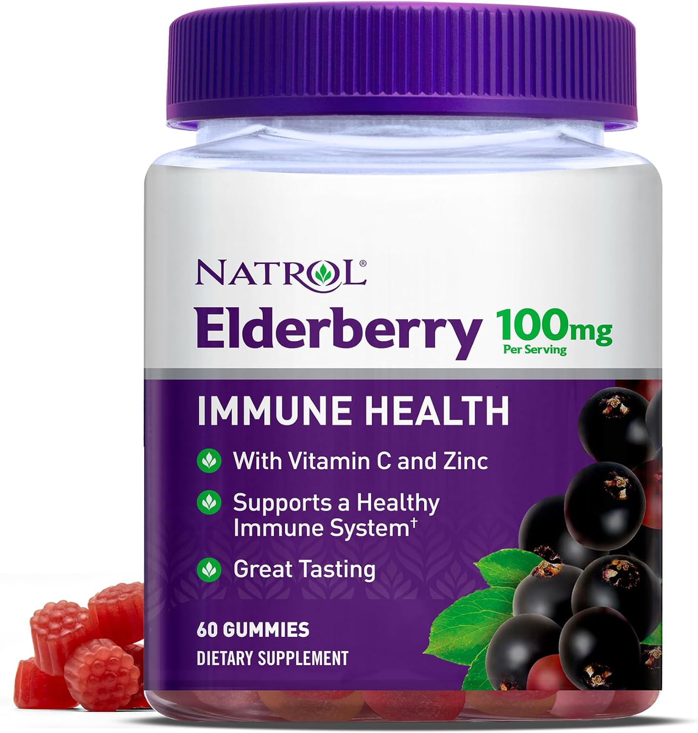 DESCRIPTION : Natrol Elderberry Gummies, with Vitamin C and Zinc, Supplement for Immune Support+, 60 Delicious Gummies