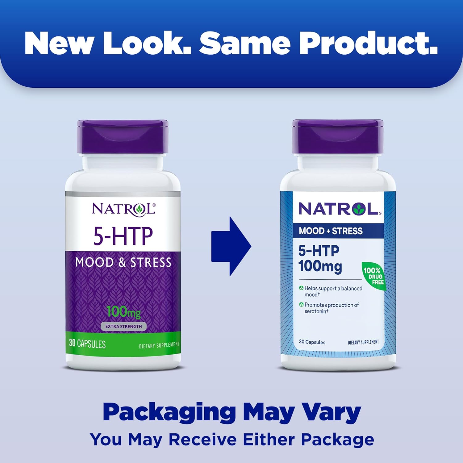 Natrol Mood + Stress 5-HTP Capsules offer a dietary supplement option to help support a balanced mood(1). These supplements provide 100 mg of 5-HTP. Natrol 5-HTP promotes the production of serotonin, which is associated with general well-being, and helps support a balanced mood(1). A 100% drug free supplement and made with no milk, egg, fish, crustacean shellfish, tree nuts, peanuts, wheat, soybeans or sesame. Adults, take one capsule up to two times daily with a meal. Natrol is committed to creating innovative, quality products to support your health and well-being in your busy, modern lifestyle. (1)These statements have not been evaluated by the Food and Drug Administration. This product is not intended to diagnose, treat, cure or prevent any disease
