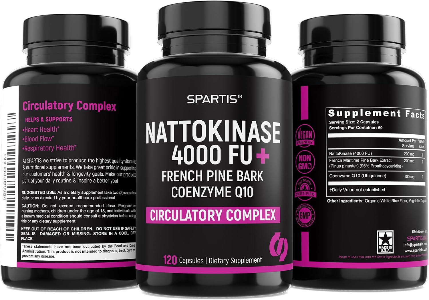 Nattokinase Supplement 4000 Fu Coq10 100Mg French Maritime Pine Bark Extract 200Mg With Enzymes For Circulatory & Cardiovascular Support (Pack Of 1 At 120-Caps)