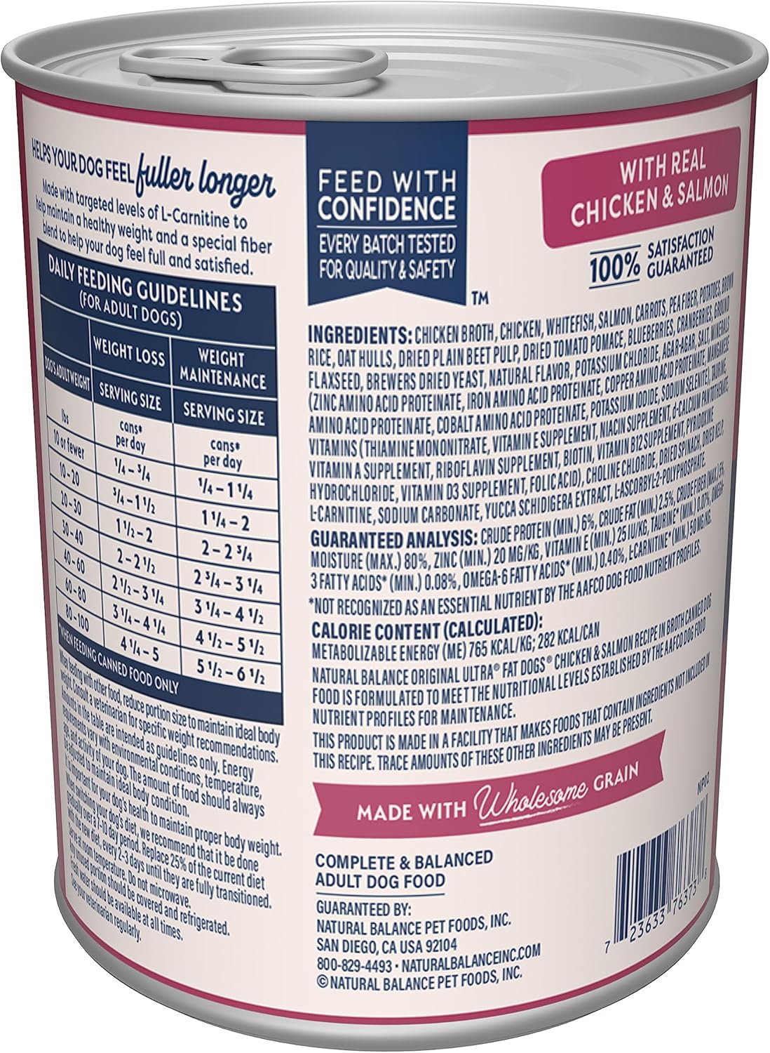 Natural Balance Original Ultra Fat Dogs Adult Low Calorie Wet Dog Food For Overweight Dogs, Chicken & Salmon Recipe In Broth, 13-Oz. Can (Pack Of 12)