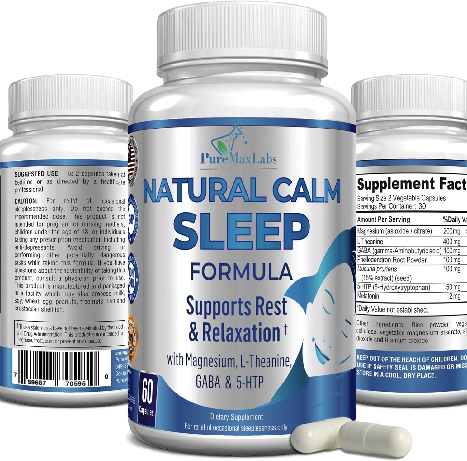 About this item Fall asleep faster and have a more calm, relaxed and restful sleep. PureMax Labs Natural Calm Sleep Formula uses a synergistic combination of amino acids and ingredients that stimulate your body’s natural processes to fall asleep. It puts your mind and body in a calmer more relaxed state so you feel more rested. Gentle Safe and Natural - The ingredients work by assisting the sleep and calming processes that naturally occur in your body and mind. There are no harsh chemicals or ingredients that can cause a groggy unsatisfying sleep. You’ll wake up feeling refreshed with no lingering grogginess. Our formula is calming and helps you relax and fall asleep. It will also help you to get deeper and more restful sleep. PureMax Labs Natural Calm Sleep Formula is manufactured in the USA in an FDA inspected, Good Manufacturing Practice Certified facility from premium ingredients and is 3rd party lab tested. See more product details,Fall asleep faster and have a more calm, relaxed and restful sleep. PureMax Labs Natural Calm Sleep Formula uses a synergistic combination of amino acids and ingredients that stimulate your body’s natural processes to fall asleep. It puts your mind and body in a calmer more relaxed state so you feel more rested,Gentle Safe and Natural - The ingredients work by assisting the sleep and calming processes that naturally occur in your body and mind. There are no harsh chemicals or ingredients that can cause a groggy unsatisfying sleep. You’ll wake up feeling refreshed with no lingering grogginess,Our formula is calming and helps you relax and fall asleep. It will also help you to get deeper and more restful sleep,PureMax Labs Natural Calm Sleep Formula is manufactured in the USA in an FDA inspected, Good Manufacturing Practice Certified facility from premium ingredients and is 3rd party lab tested
