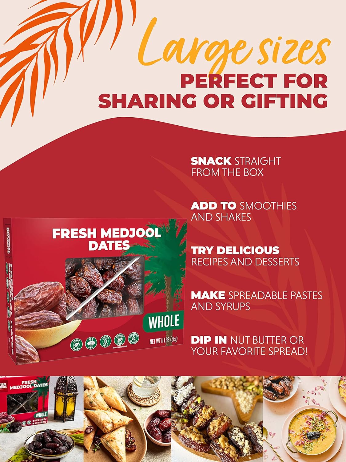 About this item FRESH WHOLE DATES - Our whole dates are always freshly picked & are the true bounty of Bard Valley. Traditionalists believe it's the best way to enjoy a date - either way they are packed full of nutrients & deliver a sweet caramel flavor GROWN IN RICH-SOIL - Location and soil health are everything! Grown in Bard Valley, our premium dates are a pure & wholesome superfood picked at peak ripeness for naturally sweet & large medjool dates HEALTHY INDULGENCE - Natural Delights whole Medjool dates are nutrient-dense containing 16 essential vitamins & minerals & are on low glycemic index giving you long-lasting energy & satisfying your sweet tooth VERSATILE FRESH FRUIT - You can munch on this low-fat snack alone or get creative with ‘em! Chop & add as a salad topper, make frozen fruit smoothies, make a date paste, use as a sugar substitute for desserts - the possibilities are endless RAISED ON SUNSHINE - We work with Earth’s resources to sustainably grow and harvest our Medjool Dates. They are raised on sunshine - from bud to ripeness & are hand-picked - no pesticides, additives, or GMOs › See more product details,FRESH WHOLE DATES - Our whole dates are always freshly picked & are the true bounty of Bard Valley. Traditionalists believe it's the best way to enjoy a date - either way they are packed full of nutrients & deliver a sweet caramel flavor,GROWN IN RICH-SOIL - Location and soil health are everything! Grown in Bard Valley, our premium dates are a pure & wholesome superfood picked at peak ripeness for naturally sweet & large medjool dates,HEALTHY INDULGENCE - Natural Delights whole Medjool dates are nutrient-dense containing 16 essential vitamins & minerals & are on low glycemic index giving you long-lasting energy & satisfying your sweet tooth,VERSATILE FRESH FRUIT - You can munch on this low-fat snack alone or get creative with ‘em! Chop & add as a salad topper, make frozen fruit smoothies, make a date paste, use as a sugar substitute for desserts - the possibilities are endless,RAISED ON SUNSHINE - We work with Earth’s resources to sustainably grow and harvest our Medjool Dates. They are raised on sunshine - from bud to ripeness & are hand-picked - no pesticides, additives, or GMOs