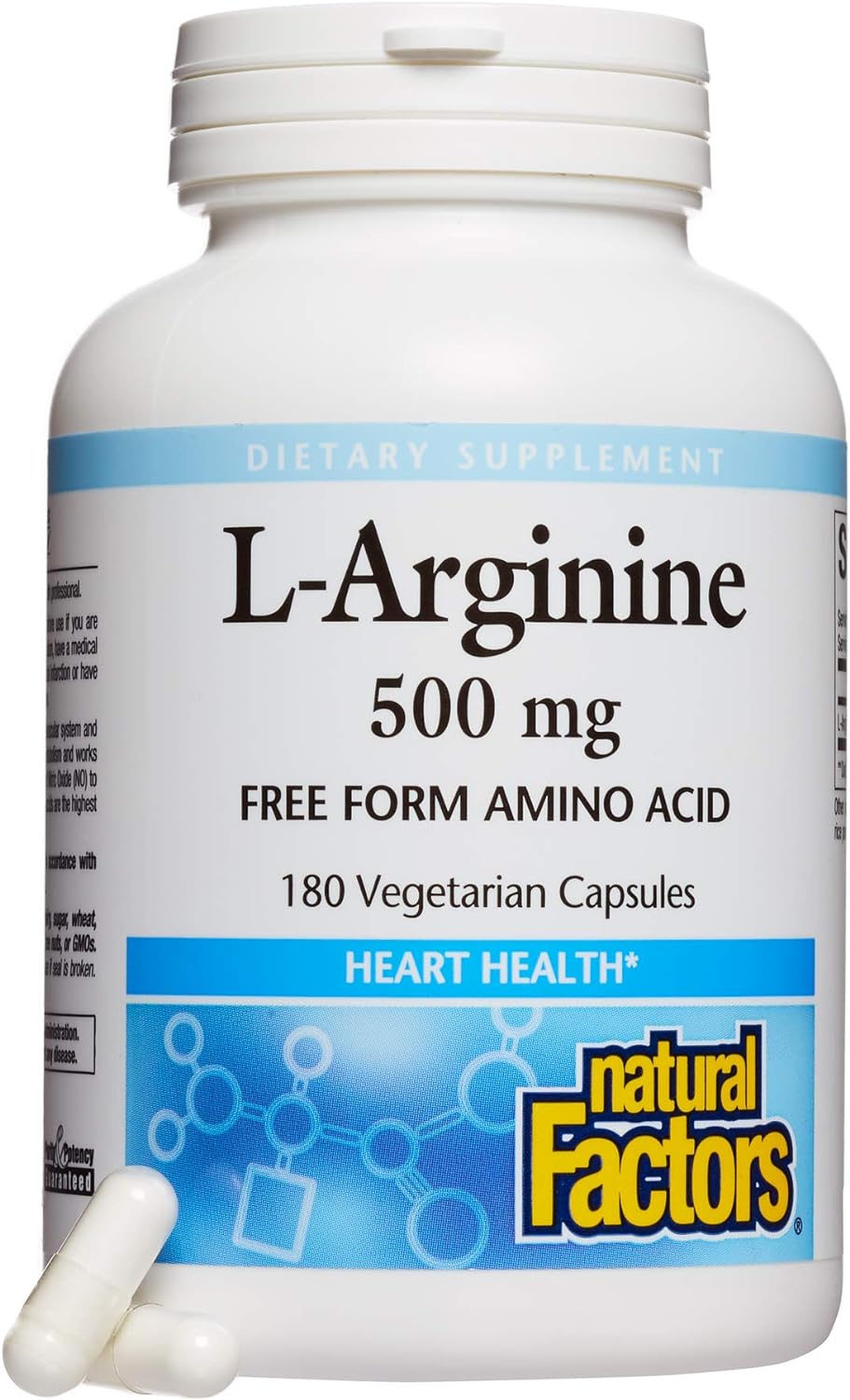 Natural Factors, L-Arginine 500 Mg, Supports A Healthy Cardiovascular System, Heart And Muscle Metabolism, 180 Capsules (180 Servings)