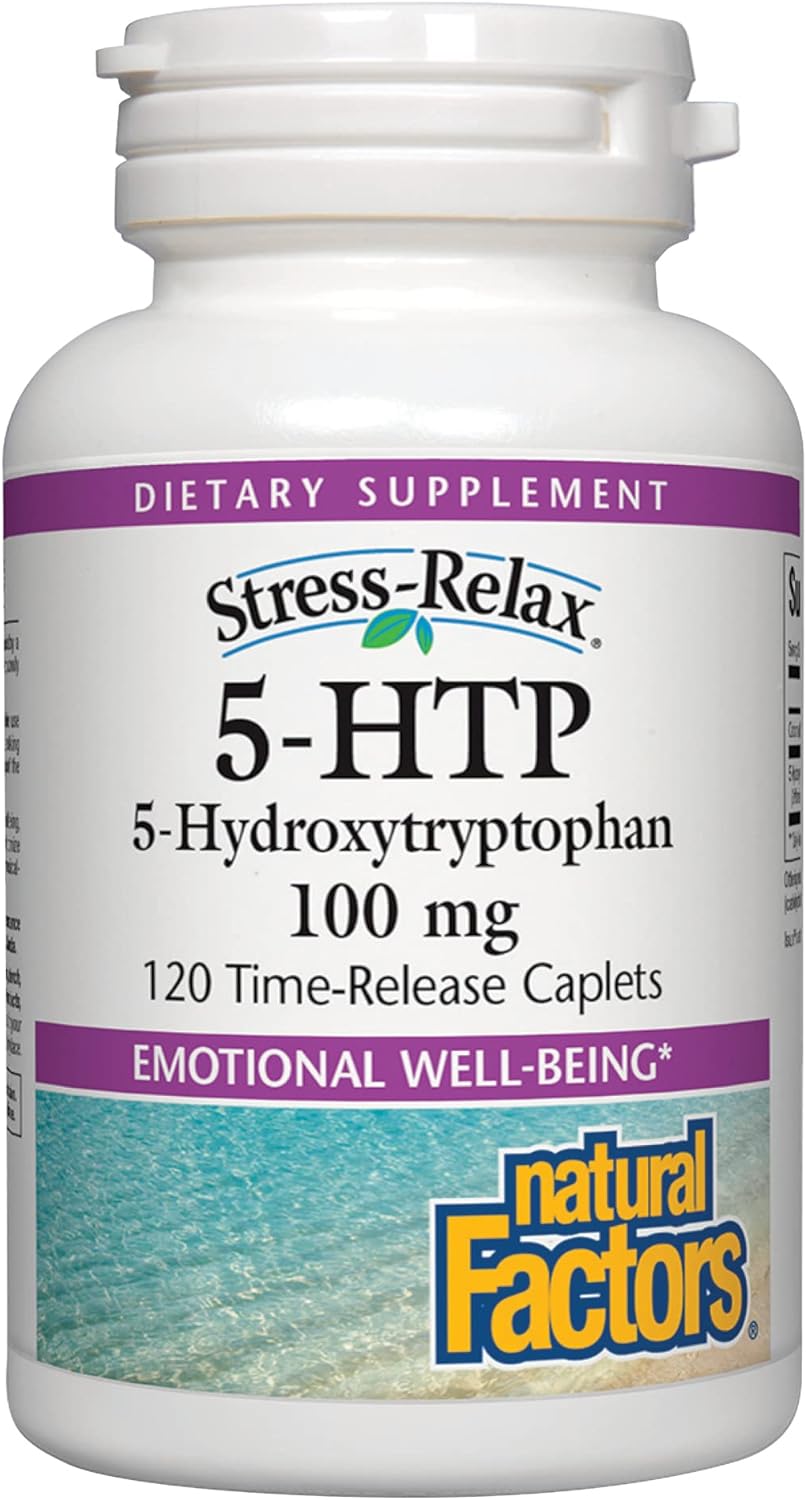 Promotes emotional well-being:* 5-HTP has been shown to positively affect serotonin levels,* which promotes restful sleep, helps manage stress and supports appetite control10Time-release caplets: Minimize gastric discomfort while optimizing absorption, thus heightening results10One caplet: Taken 2-3 times daily with meals;* To minimize the risk of gastrointestinal side effects, slowly increase dose over two weeks10Our approach to stress reduction: The Natural Factors Stress-Relax product line provides a synergistic and comprehensive approach to support mood, sleep and concentration10High-quality supplements: Independently tested and third-party certified for GMOs and over 800 contaminants using advanced technology such as mass spectrometry to ensure purity and potency10Maintaining healthy serotonin levels can have a positive impact on your mood, sleep and digestion. Our high-quality, pharmaceutical-grade 5-HTP supplement is designed to support serotonin production, promoting a calm state of mind and improved sleep. The timed-release caplets minimize gastric discomfort and optimize absorption. Simply take 1 caplet 1-3 times daily with your meals to experience the benefits. This supplement contains no artificial colors, preservatives or sweeteners and is suitable for vegans and vegetarians. It is also dairy, sugar and gluten-free.* *These statements have not been evaluated by the FDA. This product is not intended to diagnose, treat, cure or prevent any disease10