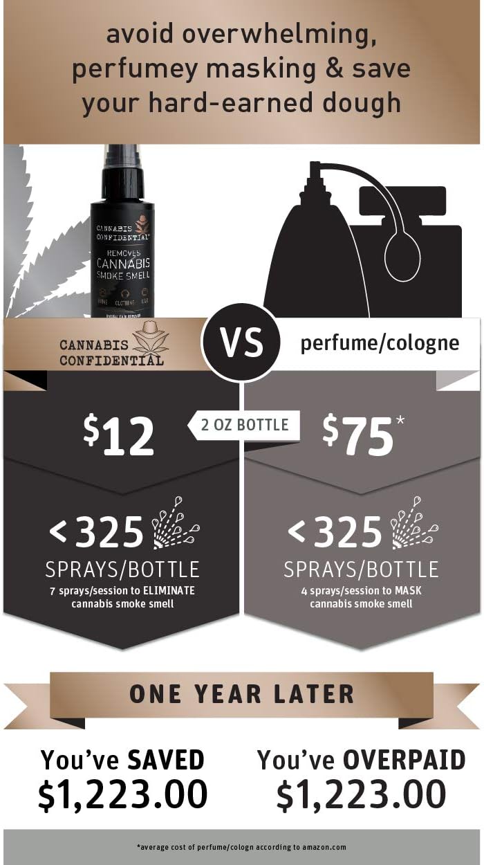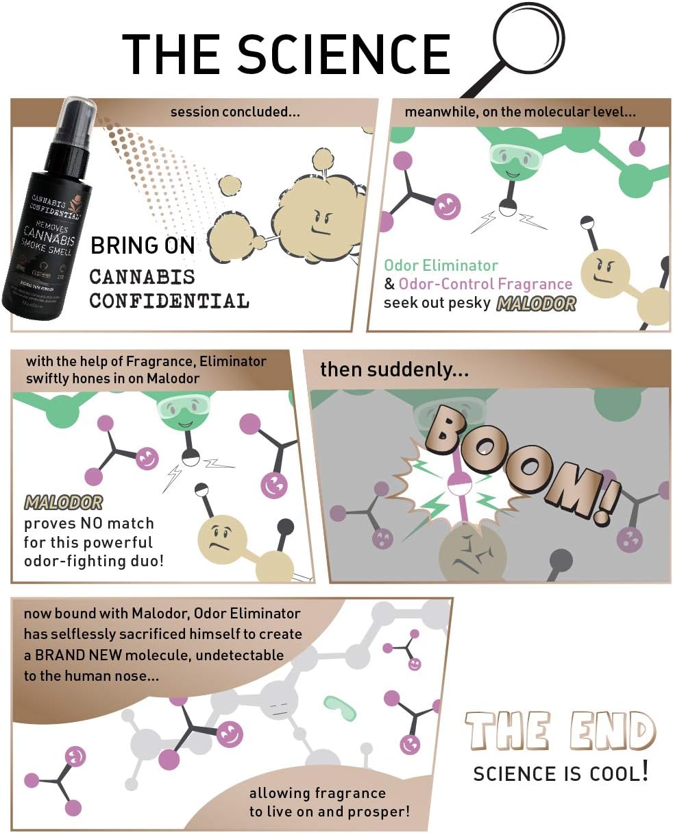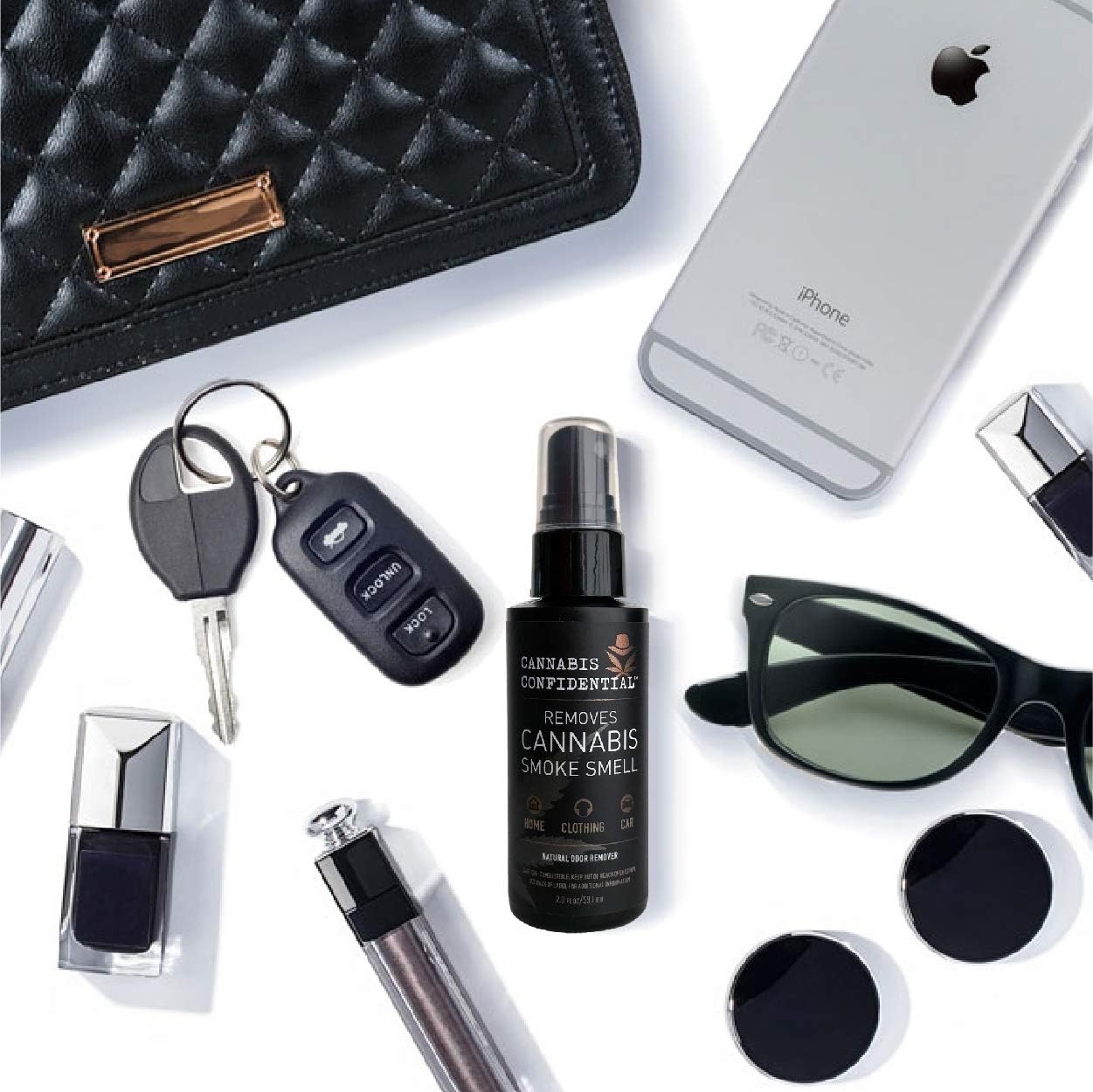 Contains 2 - 2 ounce travel friendly bottles of Cannabis Confidential Natural Odor Remover Spray10Safely and instantly removes smoke odors from hands, hair, clothing, house and car10Super gentle on your skin and hair. Naturally neutralizes the smell of smoke - no masking here10Contains a blend of great smelling natural ingredients. Not an overwhelming, chemically-smelling air freshener10Proudly made in the USA. Cruelty Freeānever tested on animals