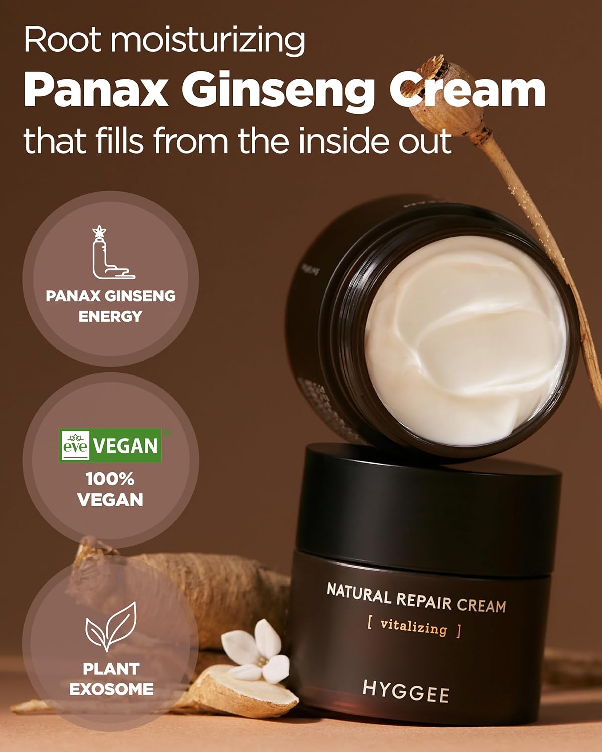 About this item VEGAN PREMIUM FORMULATION: This 100% vegan-certified cream combines the traditional benefits of red ginseng with modern plant-based science, delivering a high concentration of saponins and other vital nutrients directly to your skin, enhancing its natural vitality and strength. ELASTICITY AND WRINKLE CARE: Empower your skin with our Natural Repair Cream, which targets signs of aging by improving both inner and outer skin elasticity. Rich in plant-derived peptides and red ginseng, it helps reduce the appearance of wrinkles while providing essential nourishment. DEEP MOISTURIZING COMPLEX: Our cream features a triple moisturizing blend of shea butter, jojoba seed oil, and meadowfoam seed oil. This combination locks in moisture, balancing oil levels and ensuring high hydration without leaving any sticky residue. HYPOALLERGENIC AND SENSITIVE SKIN FORMULA: Specially formulated for sensitive skin, this hypoallergenic cream offers smooth care without causing irritation. Its plant-derived exo-barrier complex helps soothe and improve disheveled skin conditions effectively. USAGE INSTRUCTIONS: For best results, use as the final step in your skincare routine. Apply an appropriate amount of the Natural Repair Cream to your face, gently spreading it and tapping for better absorption. This fragrance-free and artificial pigment-free formula is suitable for both day and night use. See more product details,VEGAN PREMIUM FORMULATION: This 100% vegan-certified cream combines the traditional benefits of red ginseng with modern plant-based science, delivering a high concentration of saponins and other vital nutrients directly to your skin, enhancing its natural vitality and strength,ELASTICITY AND WRINKLE CARE: Empower your skin with our Natural Repair Cream, which targets signs of aging by improving both inner and outer skin elasticity. Rich in plant-derived peptides and red ginseng, it helps reduce the appearance of wrinkles while providing essential nourishment,DEEP MOISTURIZING COMPLEX: Our cream features a triple moisturizing blend of shea butter, jojoba seed oil, and meadowfoam seed oil. This combination locks in moisture, balancing oil levels and ensuring high hydration without leaving any sticky residue,HYPOALLERGENIC AND SENSITIVE SKIN FORMULA: Specially formulated for sensitive skin, this hypoallergenic cream offers smooth care without causing irritation. Its plant-derived exo-barrier complex helps soothe and improve disheveled skin conditions effectively,USAGE INSTRUCTIONS: For best results, use as the final step in your skincare routine. Apply an appropriate amount of the Natural Repair Cream to your face, gently spreading it and tapping for better absorption. This fragrance-free and artificial pigment-free formula is suitable for both day and night use