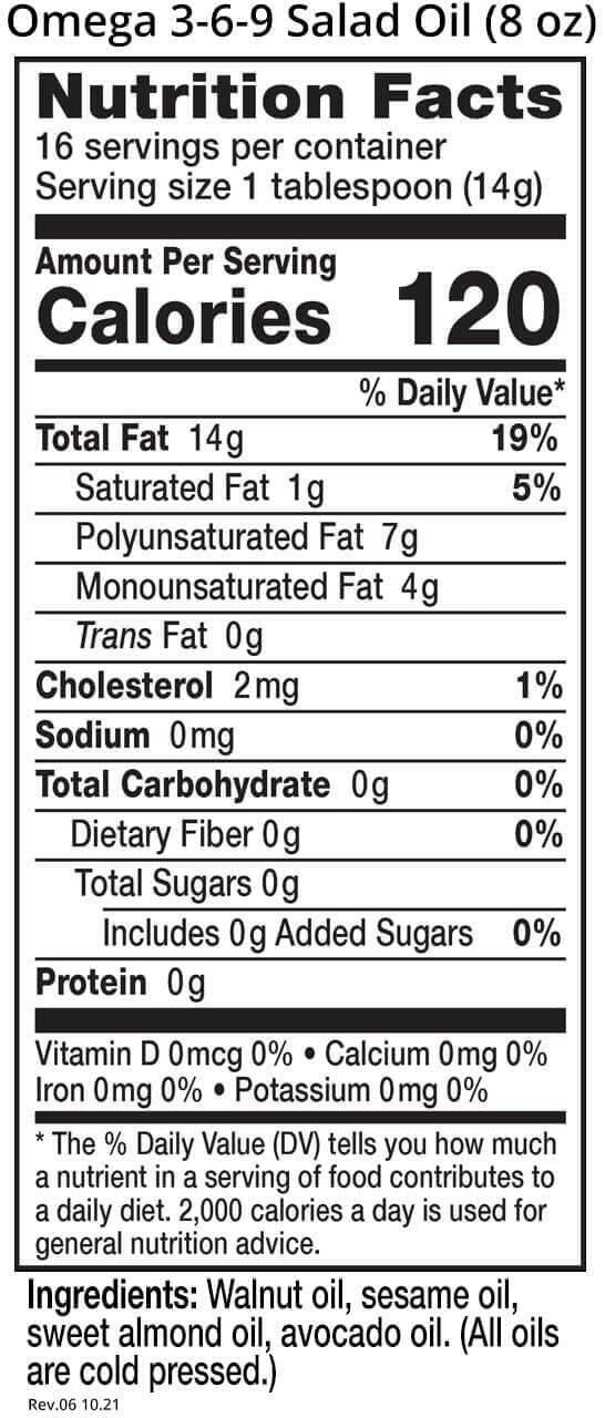 Omega 3-6-9 Salad Oil is a premium blend of cold pressed walnut, sesame, sweet almond, & avocado oils. It has a neutral taste, delicate flavor & pleasing texture that enhances salad dressings