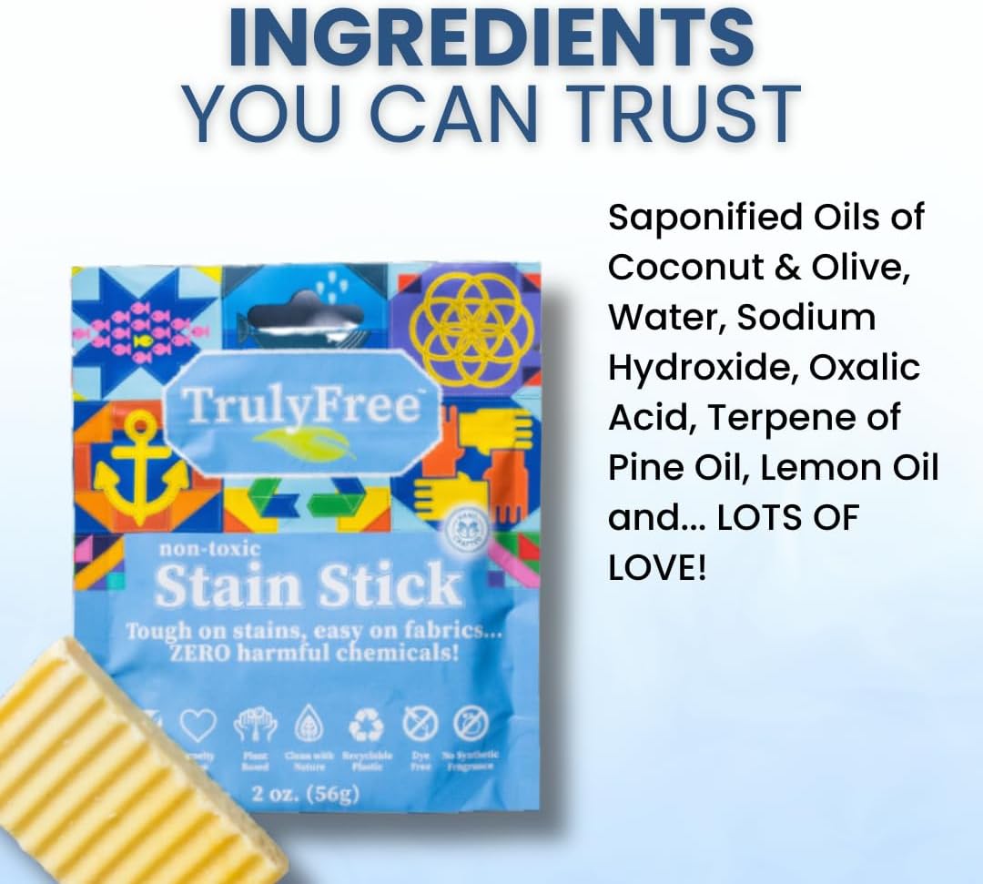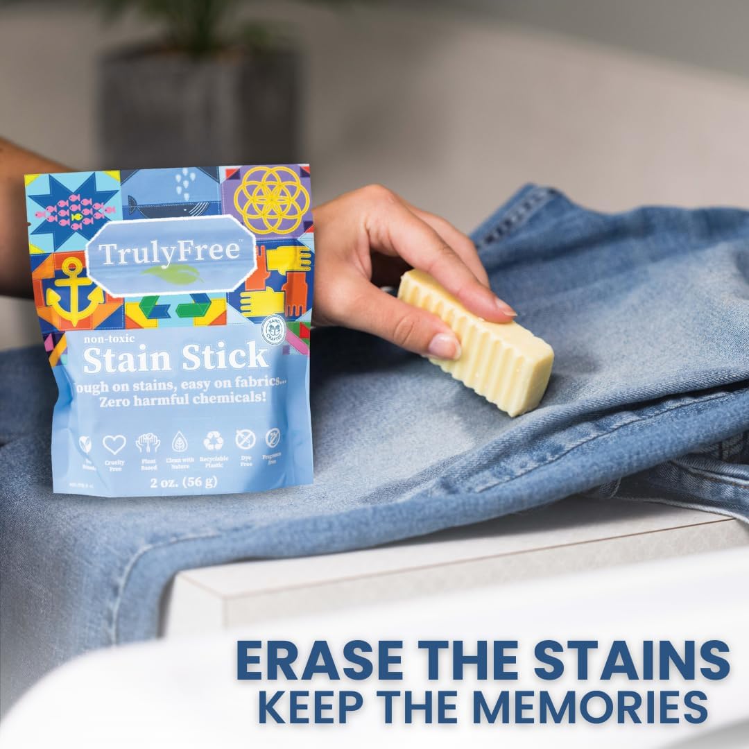 Truly Free's stain treater is mom and dad's ultimate defense for powerful stain removal against stains caused by messy eaters, outdoor adventurers with grass stains, and is the perfect baby stain remover for laundry10Proudly made without any peroxide, chlorine bleach, phosphates, SLS, dimethicone, surfactants, silicone products, glycol, dyes, fillers, phosphates, 1,4-dioxane, chlorine, DEA, thickeners, formaldehyde, petrochemicals, or optical brighteners10Quickly and safely removes food stains from clothing, newborn clothing, infant clothing, bibs, cloth diapers, furniture, rugs, carpets, linens and more; simply wet both garment area & stain stick, scrub until later appears and wash normally10Works magically on set-in stains, like berry juice, baby food, formula, ketchup, spaghetti sauce, dirt and other stubborn stains - even adult stains like red wine, blood stain remover for clothes, armpit stains, or oil stain remover for clothes10Compact and easy to take on the go for travel stains. Works on tough stains unlike stain remover spray. Bag reseals to keep the stain stick fresh for your next stain. Proudly made in the USA in Michigan