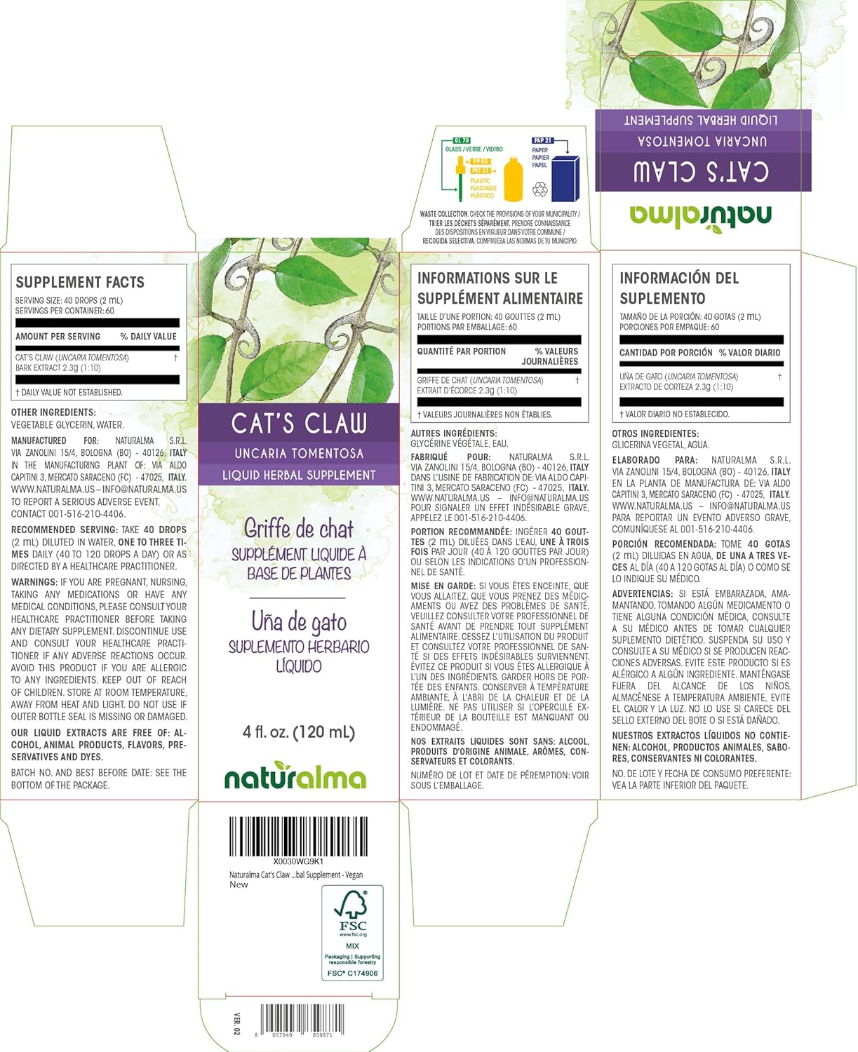 Liquid herbal supplement in drops, consisting of a concentrated liquid extract , highly pure and 100% natural. All NATURALMA liquid extract or tinctures are made using an exclusive extraction method, which allows to obtain the maximum concentration of active ingredients. They are 100% alcohol-free and totally natural. Pleasant-tasting and without added sugar. Our herbal supplement are produced and packaged in Italy. Our liquid extract are free of: Alcohol, Animal products, Flavors, Preservatives and Colors. Glycerine is a 100% natural, plant-based and low calorie sweetener. Glyceric macerate or pure fluid extract in drops. Legal Disclaimer Statements regarding dietary supplements have not been evaluated by the FDA and are not intended to diagnose, treat, cure, or prevent any disease or health condition,Cat's Claw (Uncaria tomentosa) bark liquid extract or tincture concentrated 1:10. 100% natural, alcohol and sugar free. MADE IN ITALY,A NATURAL AID: Cat's Claw liquid herbal supplement in drops. 40 drops (2 ml) contain 2.3 g of Cat's Claw extract (1:10). Glyceric macerate or pure fluid extract of Cat's Claw (Uncaria tomentosa) bark in drops,NATURALMA - A Natural Way of Life: We respect and love Nature, that's why all our supplements are Vegan and contain no artificial ingredients. We believe in the importance of guaranteeing quality and safety, so we carefully select the raw materials and manufacture the products in Italy,AT YOUR SIDE: Being attentive to your needs is a cornerstone of our philosophy. For this reason, in addition to developing supplements designed for your specific needs, we work with unique formulas to achieve the perfect synergy of ingredients and dosages. We are always available to advise and support you in your objectives, provide you with the certifications of any product, and answer all your questions. Contact us!