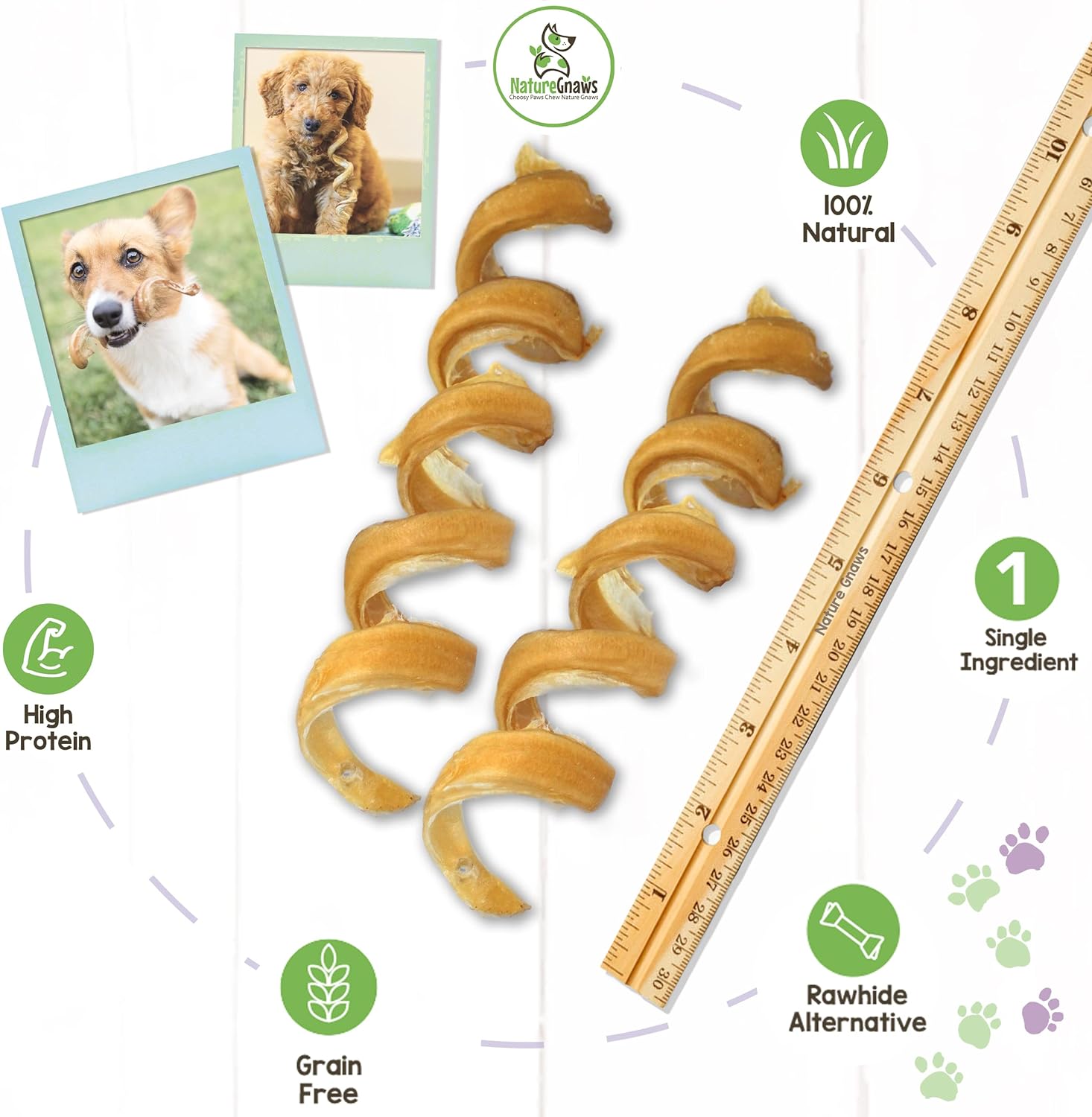 Made With Only 100% Natural Premium Quality Beef Pizzle, Our Bully Stick Springs Are A Healthy Distraction For Your Dog. These Long Lasting Bully Chews Are Perfect For Teething Puppies And Aggressive Chewers Of Small, Medium And Large Sizes. Nature Gnaws Curly Bully Sticks Are Grain-Free And Gluten-Free, Making Them The Perfect Rawhide Alternative To Bones And Manufactured Dog Bones And Dental Chews. Durable And Long Lasting, The Natural Act Of Chewing Our Small Bully Sticks Helps Reduce Plaque And Tartar For Cleaner Teeth And Fresher Breath. Promoting Overall Good Dental Hygiene, These Bully Sticks Are An Excellent Choice For Your Pet. Our Bully Stick Springs Have A Chewy Thick Texture That Are The Perfect Reward To Occupy And Entertain. Your Dog Will Love The Natural Scent And Tasty Beef Flavor Of Our Bully Twists. As A Family-Run Business, We Are Dedicated To Providing 100% Natural Dog Chews And Treats Made With Responsibly Sourced Ingredients To Ensure They Are The Best Simple, Natural, And Delicious Products For Your Beloved Pups