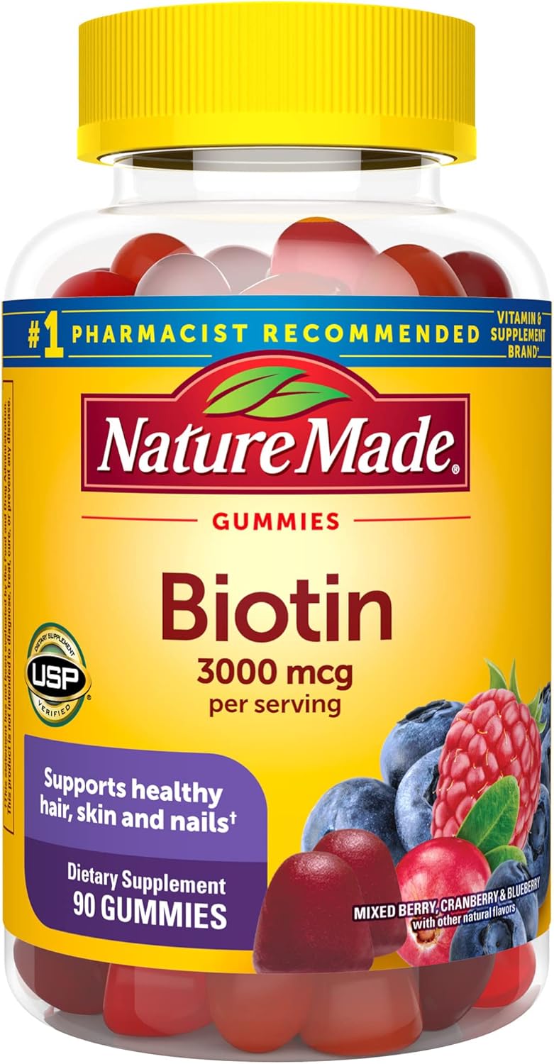 Nature Made Biotin 3000 mcg Gummies are a great-tasting dietary supplement that helps support healthy hair, healthy skin, and nail health for those low in Biotin. Sourced from high-quality ingredients and made to Nature Madeās guaranteed purity and potency standards, these Biotin gummies are gluten free and have no artificial flavors, no synthetic dyes, no high fructose corn syrup, and no artificial sweeteners. These Nature Made Biotin 3000 mcg gummies also support energy metabolism(1). Available in delicious mixed berry, cranberry, blueberry, and other natural flavors, these Biotin gummies are a great option for people who want to supplement their Biotin intake. Adults, chew two of these Biotin vitamins for hair skin and nails support daily. Nature Made supplements are quality you can trust. USP has tested and verified ingredients, potency, and manufacturing process. USP sets official standards for dietary supplements. Visit the USP verified website for more information. (1)Helps convert food into cellular energy. *Based on a survey of pharmacists who recommend branded vitamins and supplements